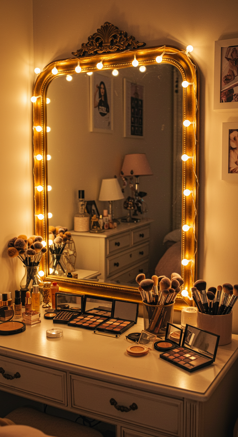 Créez votre propre miroir de star en encadrant votre miroir mural avec des guirlandes lumineuses. Cette technique transforme un simple miroir en un élément décoratif sophistiqué tout en fournissant un éclairage flatteur pour votre routine beauté.