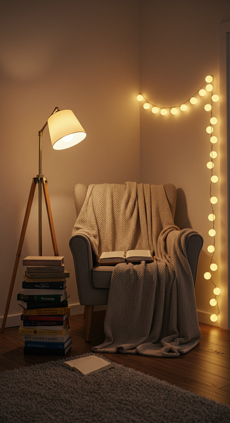 Pour concevoir ce havre de paix, choisissez d’abord un coin tranquille de votre maison : près d’une fenêtre, dans un angle de votre chambre, ou même sous un escalier. Installez un fauteuil confortable, ajoutez des coussins moelleux et une couverture douce. Ensuite, créez un baldaquin de lumières au-dessus de votre espace en accrochant des guirlandes au plafond ou en les faisant descendre du mur. Vous pouvez également enrouler les guirlandes autour d’une étagère basse remplie de vos livres du moment. Ajoutez une petite table d’appoint pour votre tasse de thé, une bougie parfumée, et vous obtenez le coin lecture parfait. L’éclairage doux des guirlandes crée une atmosphère apaisante, idéale pour se plonger dans un bon livre pendant des heures sans fatiguer les yeux, surtout si vous les combinez avec une lampe de lecture directionnelle.