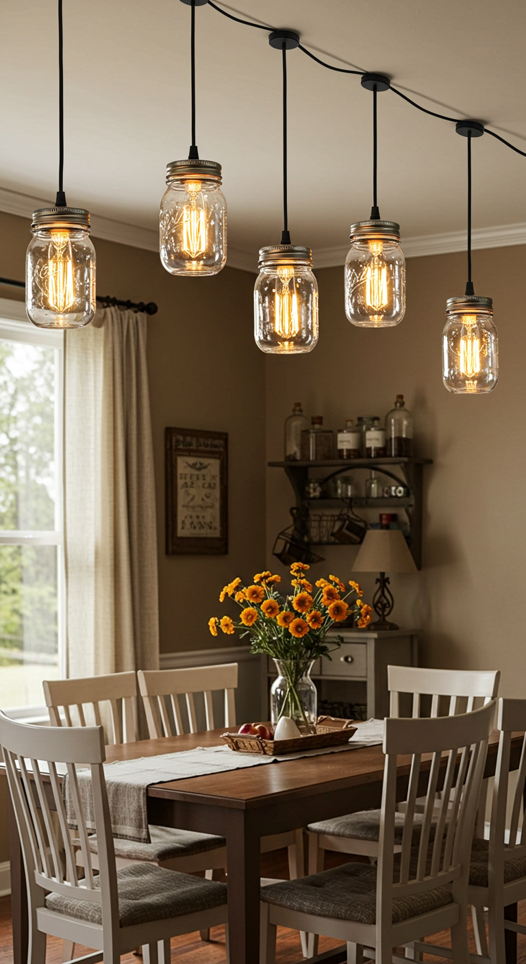Pour réaliser ces luminaires originaux, vous aurez besoin de bocaux Mason de différentes tailles, de guirlandes lumineuses à LED (de préférence à piles pour éviter les fils apparents), et de fil de fer ou de corde pour suspendre les bocaux. Insérez simplement une portion de guirlande lumineuse dans chaque bocal, en laissant le boîtier de piles discret à l’extérieur ou caché sur le dessus. Vous pouvez ensuite suspendre ces bocaux lumineux à différentes hauteurs au-dessus d’un îlot de cuisine, d’une table à manger, ou les aligner le long d’une étagère. Pour une touche supplémentaire, ajoutez du sable, des petits galets, des fleurs séchées, ou des branches à l’intérieur des bocaux avant d’y glisser les lumières. Cette décoration fonctionne magnifiquement dans les cuisines de style farmhouse, les salles à manger rustiques, ou les terrasses couvertes.