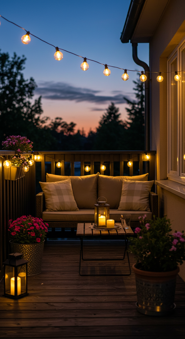 Prompt Image (English): “Outdoor patio with string lights hanging overhead, cozy terrace evening setup, bistro lights on balcony, outdoor living space, warm evening atmosphere, garden party lighting”
