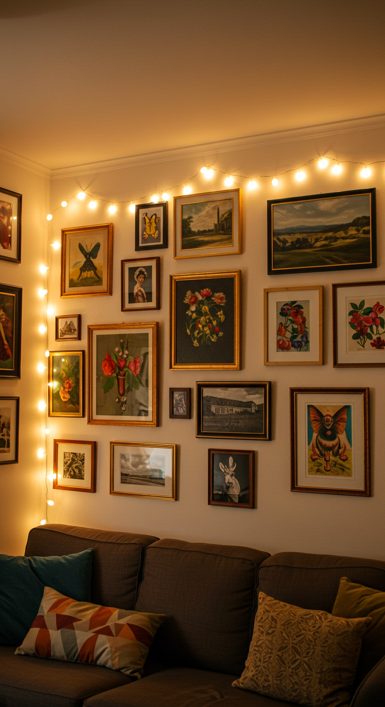 Transformez votre collection d’œuvres d’art, de photos, ou d’affiches en une véritable galerie personnelle en ajoutant un éclairage d’ambiance avec des guirlandes lumineuses. Cette technique met en valeur vos pièces préférées tout en créant une atmosphère de galerie sophistiquée.