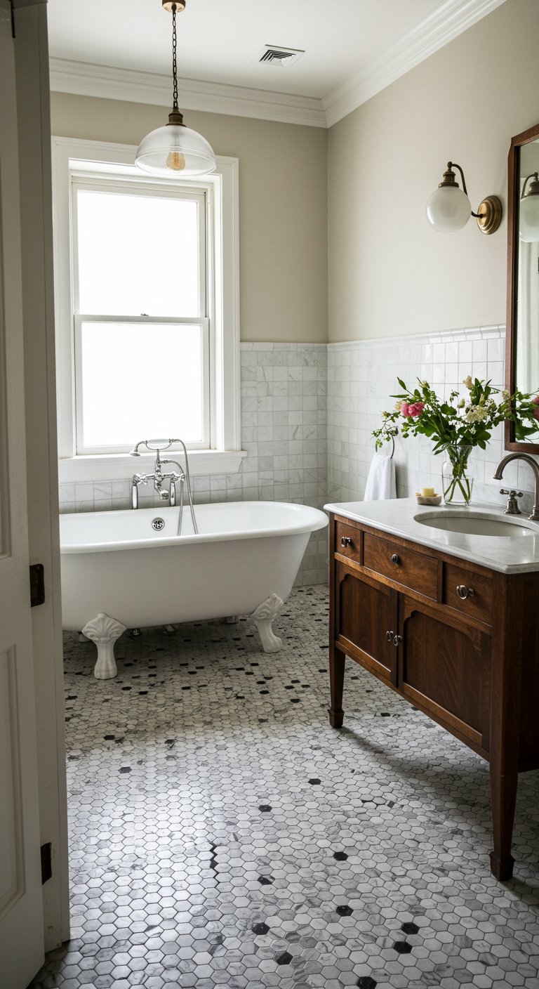 Ce type de carrelage s’accorde particulièrement bien avec une baignoire sur pieds en fonte émaillée et un meuble vasque en bois patiné. L’ajout d’éléments en cuivre ou en bronze accentue l’authenticité vintage. Pour les murs, optez pour une couleur unie qui contraste délicatement avec le sol, comme un vert sage ou un bleu poudré.