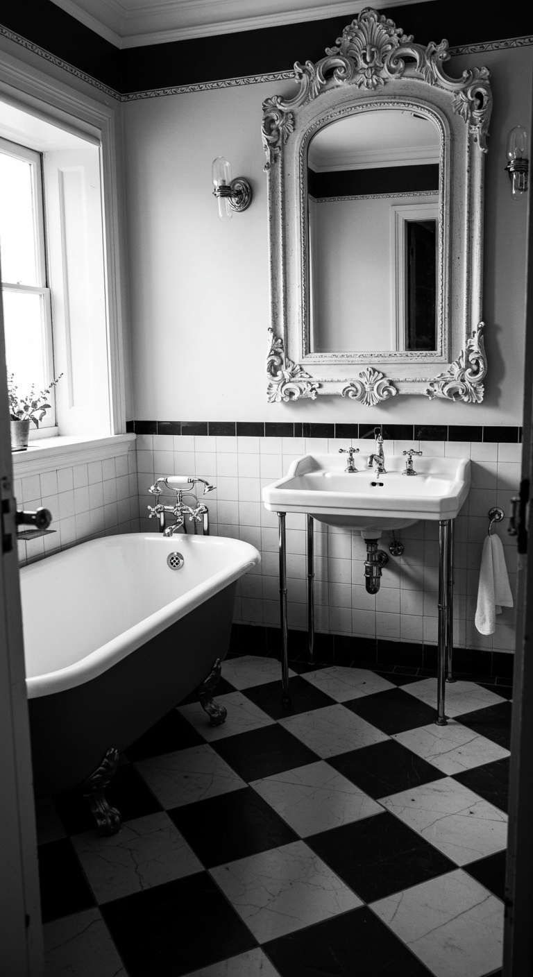 Pour équilibrer la force de ce motif, optez pour des éléments décoratifs aux lignes pures et aux matières nobles. Un meuble vasque en marqueterie, des robinets en laiton poli et des textiles dans les tons crème ou beige créeront une harmonie parfaite. Ce style convient particulièrement aux grandes salles de bain où l’effet du damier peut s’exprimer pleinement.