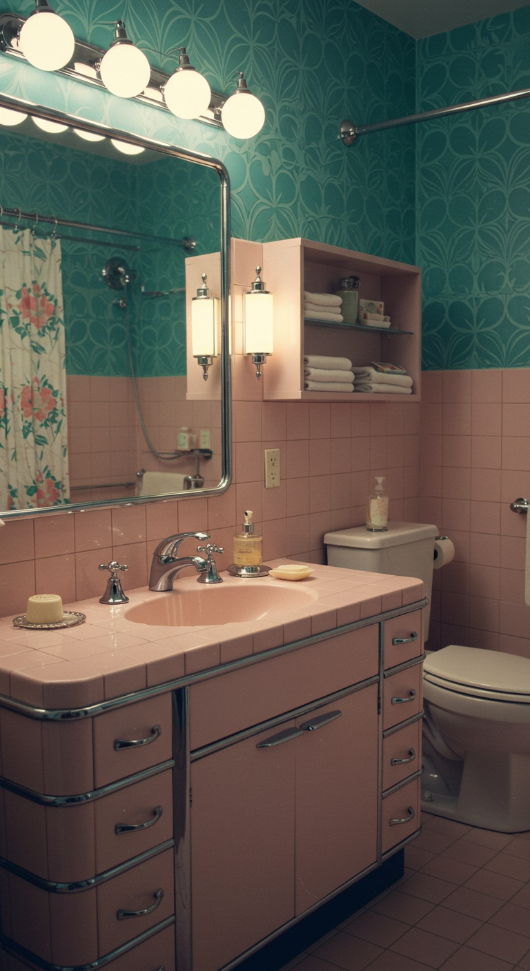 Le rose poudré, couleur phare des années 1950, apporte douceur et féminité à votre salle de bain vintage. Cette teinte délicate, loin d’être enfantine, évoque l’élégance hollywoodienne de l’époque et crée une atmosphère glamour et raffinée.