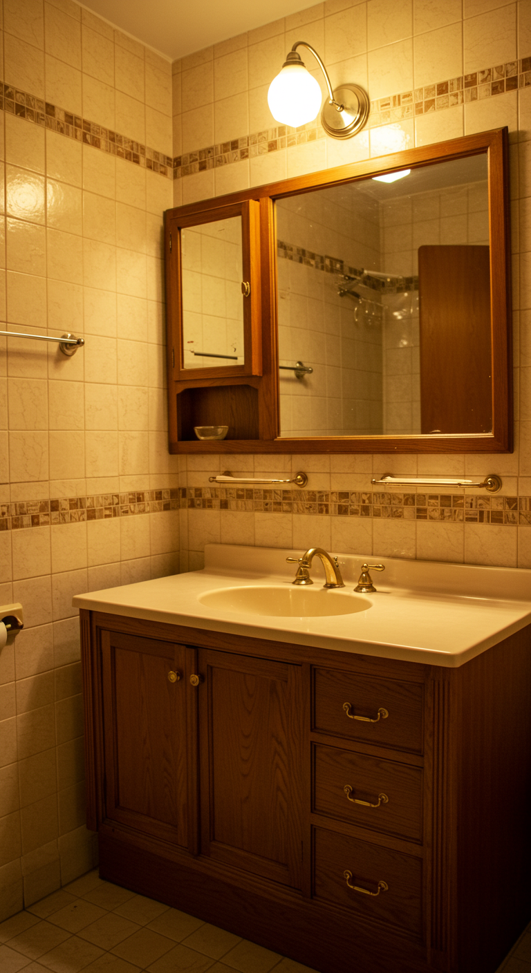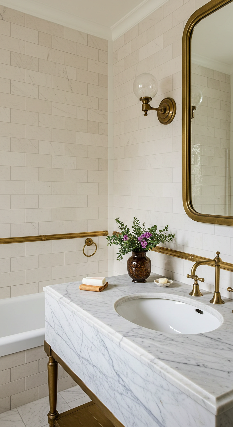 Le carrelage blanc cassé agrémenté de baguettes dorées apporte une touche d’élégance discrète à votre salle de bain vintage. Cette combinaison subtile évoque les appartements parisiens du début du XXe siècle et crée une ambiance bourgeoise et raffinée.