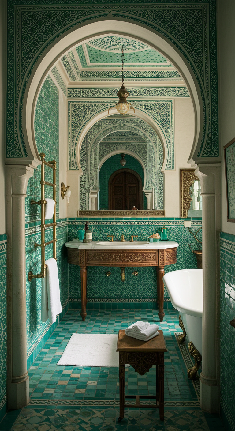 Les carreaux turquoise et blancs aux motifs marocains transportent votre salle de bain vers les riads d’antan. Ces carreaux artisanaux, aux motifs géométriques complexes, créent une mosaïque hypnotique qui transforme votre salle de bain en oasis orientale.