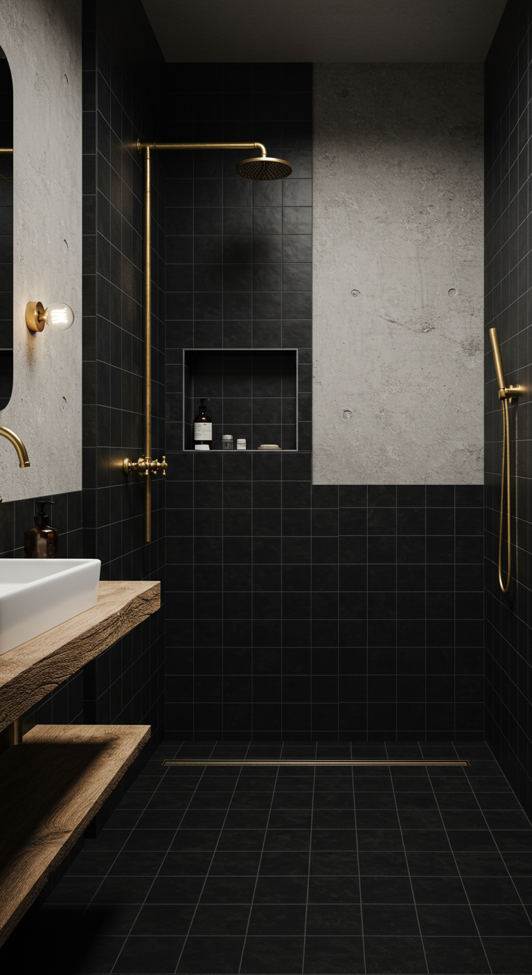 Le carrelage noir mat avec joints blancs crée un effet inverse du métro traditionnel et apporte une modernité vintage surprenante. Cette combinaison audacieuse évoque l’esprit industriel des années 1920 tout en conservant une élégance contemporaine.