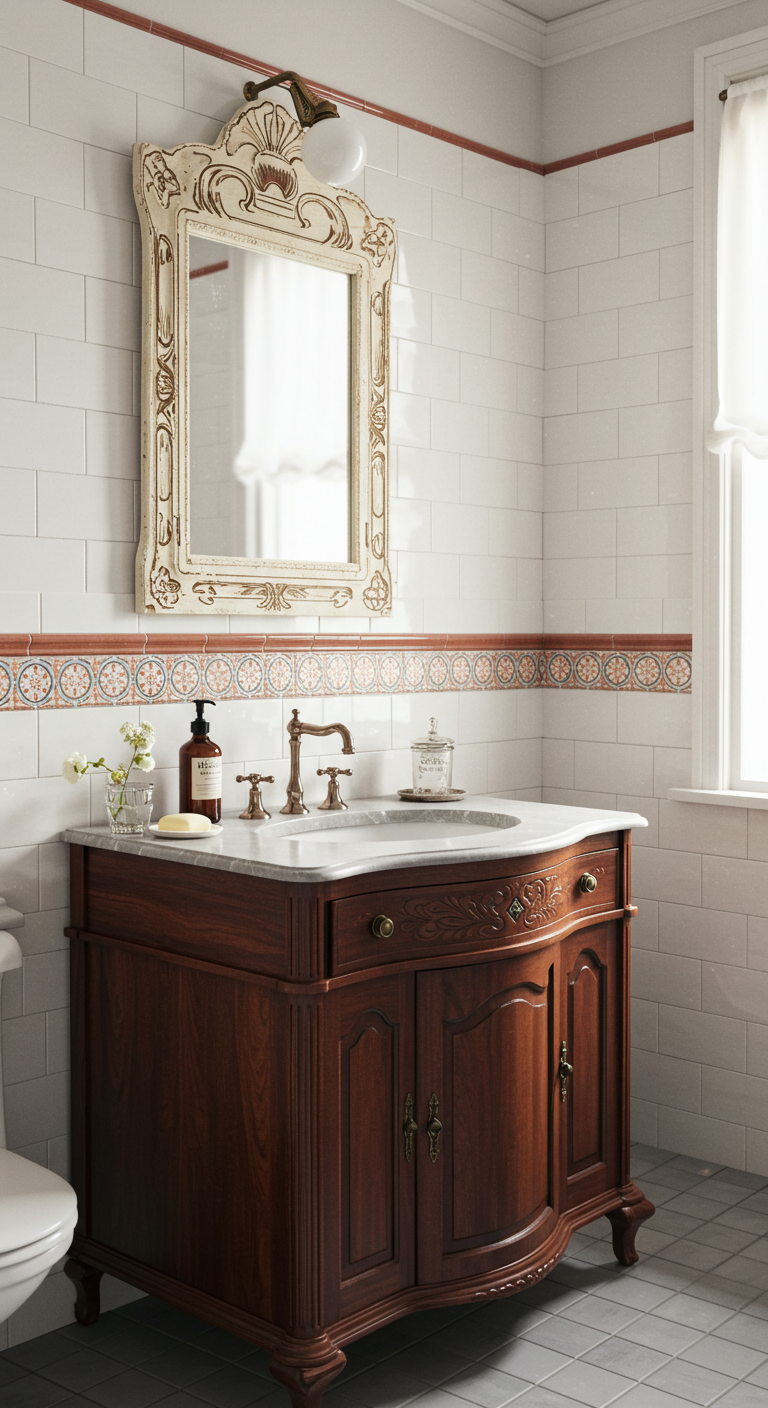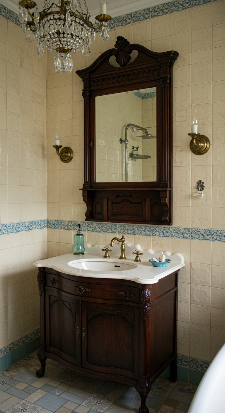 Les motifs Art Nouveau, avec leurs courbes organiques et leurs références florales, s’épanouissent particulièrement bien dans cette palette chromatique. Associez ces carreaux à des éléments aux lignes sinueuses : robinets courbes, miroirs aux formes organiques et éclairage ouvragé. Cette décoration convient aux amateurs d’art et d’histoire qui souhaitent créer une ambiance de musée dans leur intimité.