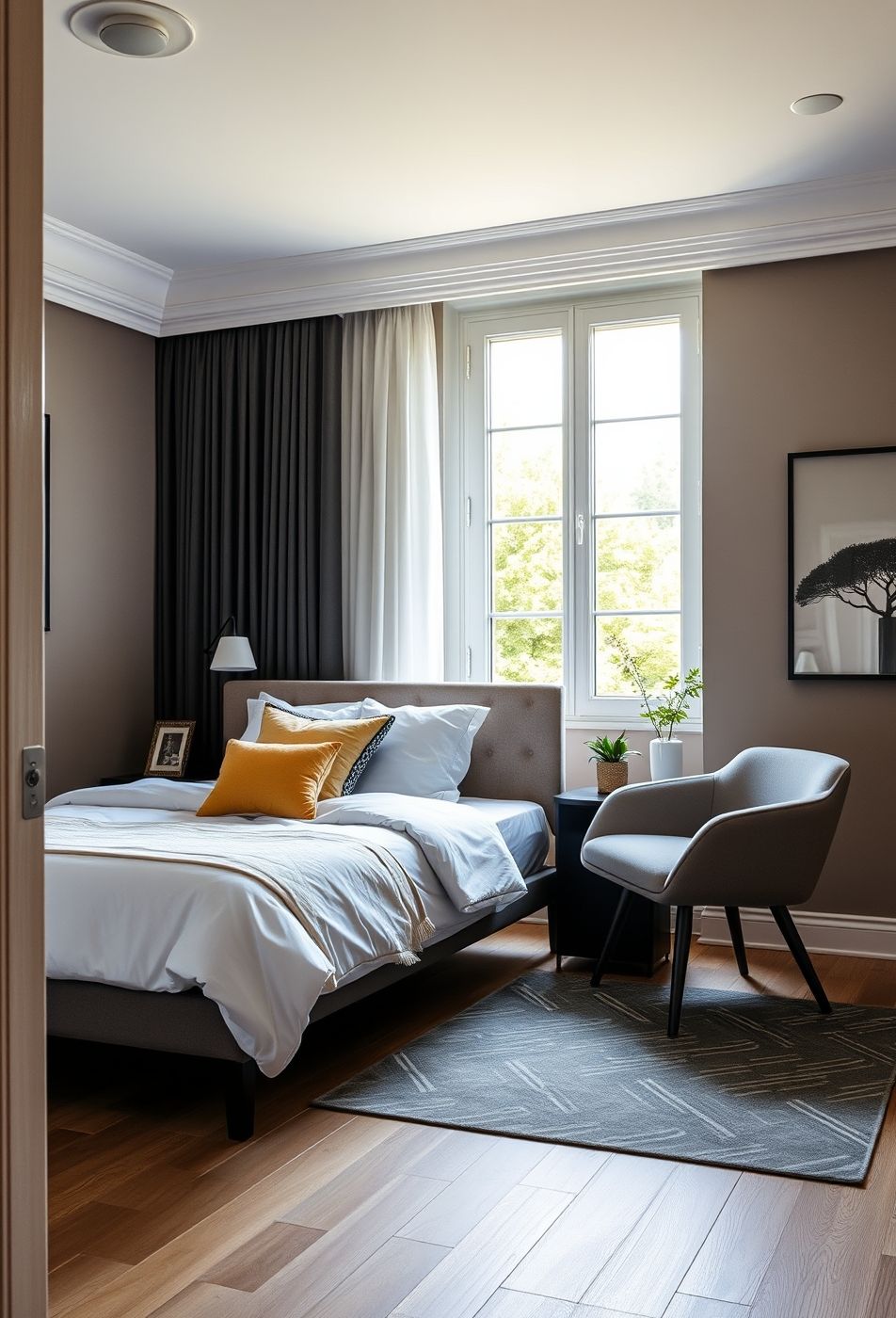 Cette chambre à coucher respire une élégance discrète et une atmosphère apaisante. La palette de couleurs est douce et neutre, dominée par des nuances de gris, de blanc cassé et de taupe, avec des touches de jaune moutarde pour un contraste subtil. Les matériaux semblent être de haute qualité, avec des textiles doux et une structure de lit discrète. La lumière naturelle inonde l’espace à travers la grande fenêtre, mise en valeur par des rideaux épais et clairs qui permettent de moduler l’intensité lumineuse.
