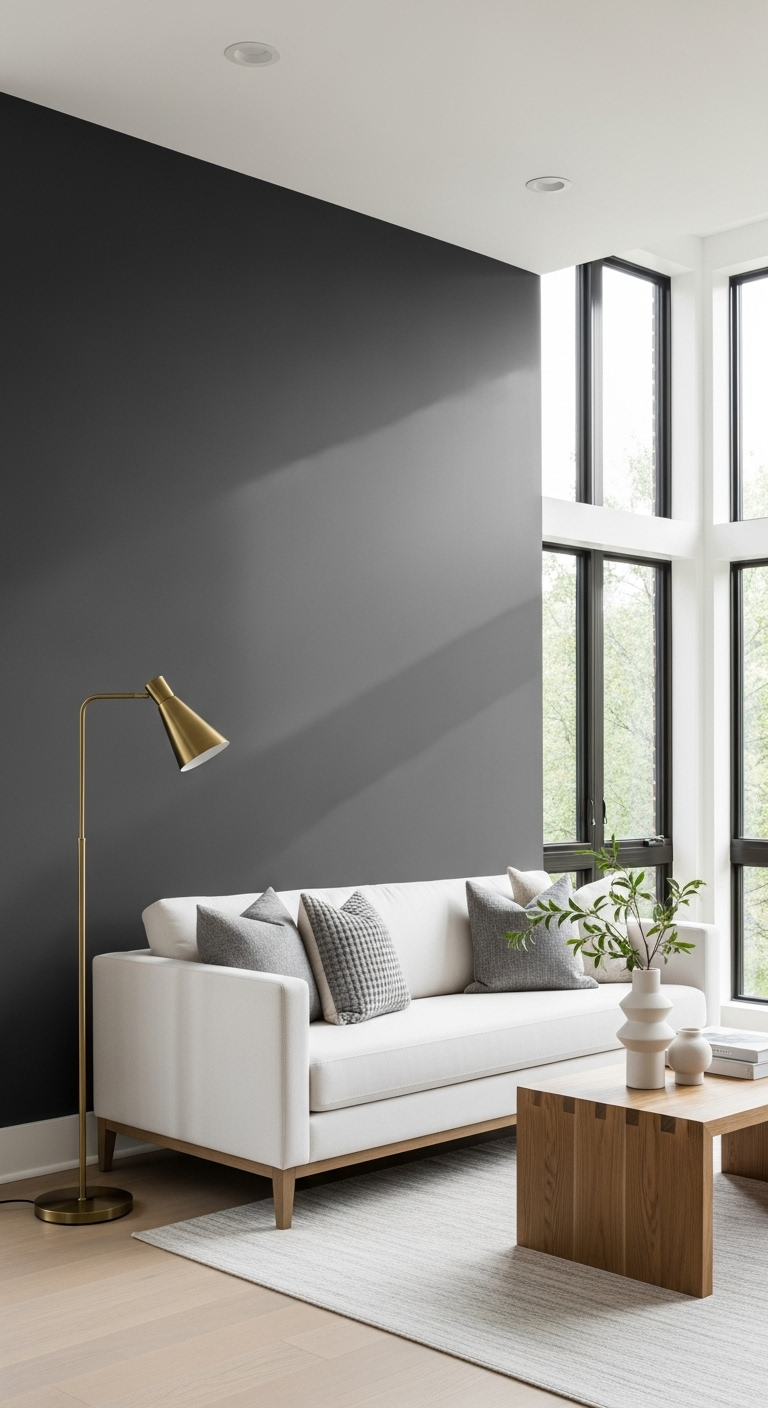 Transformer un mur de votre salon en un élégant fond anthracite est l’une des façons les plus spectaculaires d’adopter cette tendance. Ce mur d’accent crée instantanément un point focal dramatique qui attire le regard et structure l’espace.