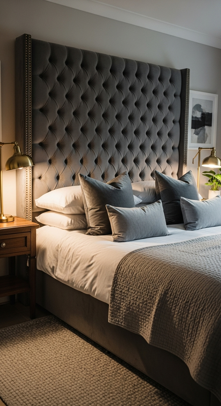Cette pièce maîtresse devient le point focal de la chambre. Optez pour un modèle XXL qui monte jusqu’au plafond pour un effet encore plus spectaculaire. Le capitonnage ajoute une dimension tactile et visuelle qui renforce l’impression de confort et de sophistication.