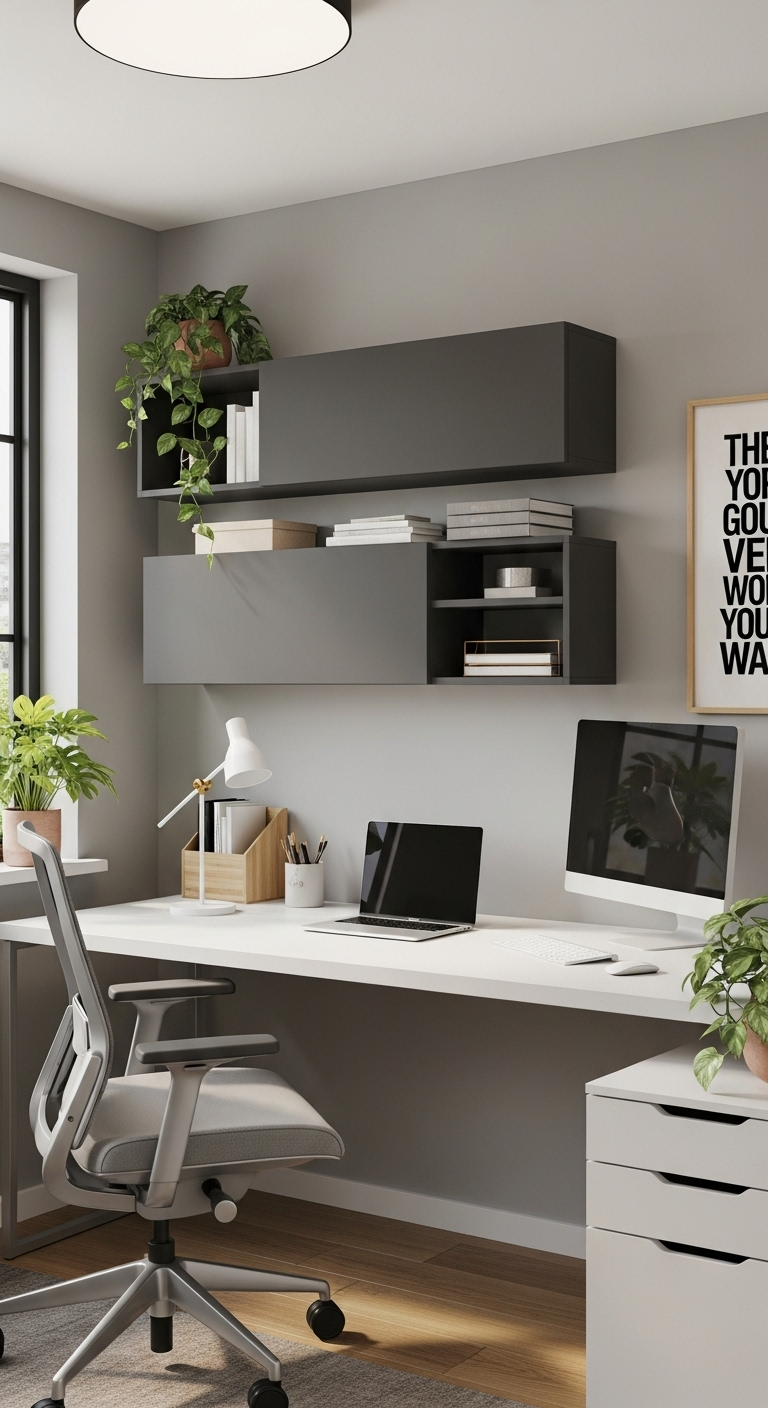 Un espace de travail habillé d’étagères murales anthracite combine fonctionnalité et style contemporain. Ces étagères créent un système de rangement élégant qui structure visuellement votre bureau tout en offrant un espace d’exposition pour vos livres et objets déco.