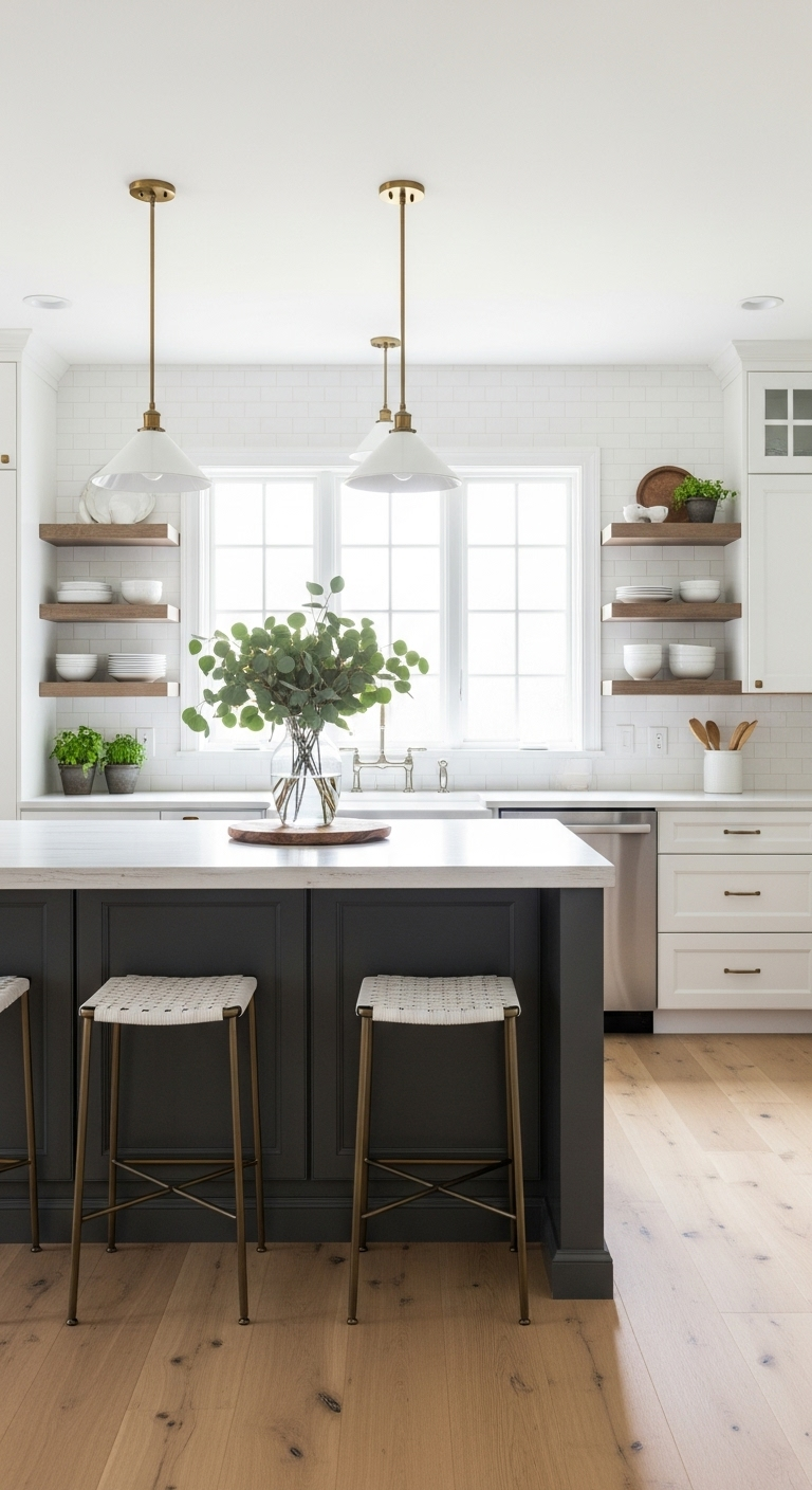 Intégrez des rangements astucieux dans votre îlot : tiroirs profonds, espace pour les livres de cuisine, niche pour les tabourets. Suspendez au-dessus des luminaires de style industriel ou des suspensions en verre pour marquer la zone et créer un éclairage fonctionnel. Ajoutez trois ou quatre tabourets de bar dans un matériau complémentaire (cuir, velours, rotin) pour transformer l’îlot en espace convivial de repas et d’échange.