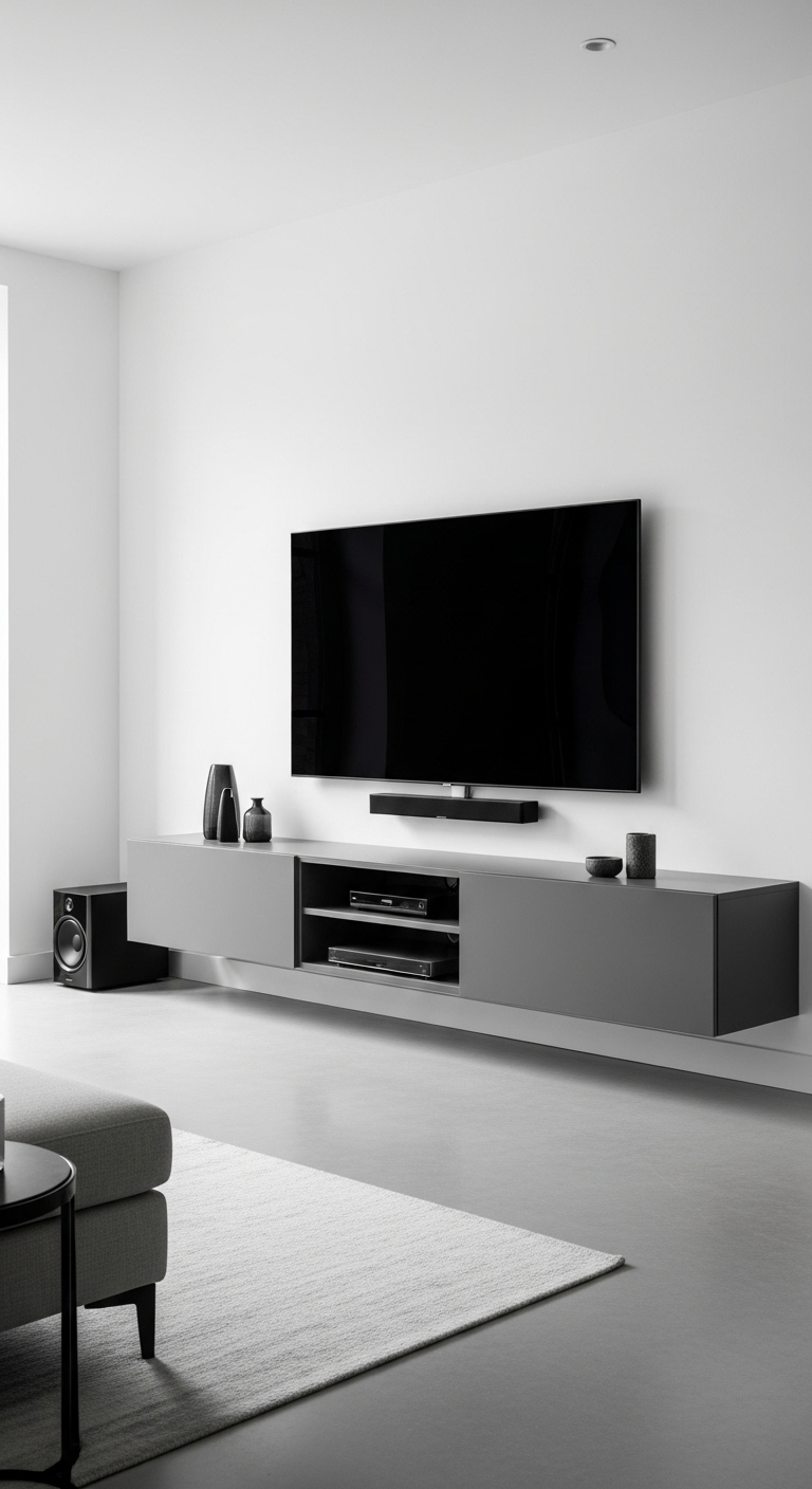 Un meuble TV suspendu en gris anthracite incarne l’esprit minimaliste contemporain. Cette solution flottante libère le sol, agrandit visuellement l’espace et facilite l’entretien tout en offrant un style épuré et moderne.