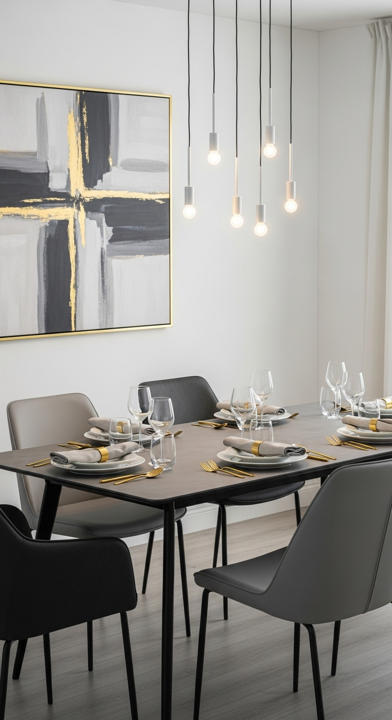 Associez votre table à des chaises dépareillées pour un look éclectique chic : mélangez velours gris, rotin naturel, et métal noir pour créer un ensemble dynamique. Suspendez au-dessus une ou plusieurs suspensions design qui descendent suffisamment bas pour créer une ambiance intime. Habillez la table avec des sets de table en lin naturel, de la vaisselle blanche ou dorée, et des couverts en laiton. Un grand vase avec des branches ou des fleurs fraîches complète ce tableau sophistiqué parfait pour recevoir.