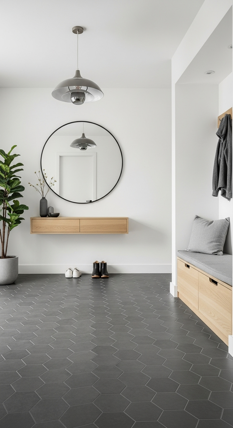 Pour maximiser l’effet, vous pouvez jouer avec différentes tailles d’hexagones ou créer un gradient en mixant des carreaux gris anthracite avec des hexagones gris clair ou blancs. Installez un banc d’entrée avec rangement en dessous, une console murale anthracite ou noire pour poser clés et courrier, et un grand miroir pour agrandir l’espace. Un luminaire suspendu design attire l’œil vers le haut et équilibre la présence du sol sombre. Ajoutez un tapis d’entrée texturé et des patères murales pour combiner fonctionnalité et esthétique.