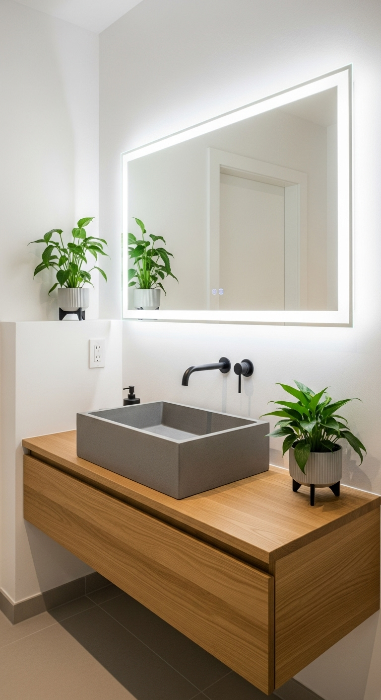 Complétez avec une robinetterie noire mate pour un look monochrome épuré, ou dorée pour plus de chaleur. L’éclairage est essentiel : prévoyez un éclairage d’ambiance indirect, des spots encastrés au-dessus de la douche, et un miroir rétroéclairé. Ajoutez des touches de bois naturel avec des accessoires et des plantes vertes pour réchauffer l’ensemble.