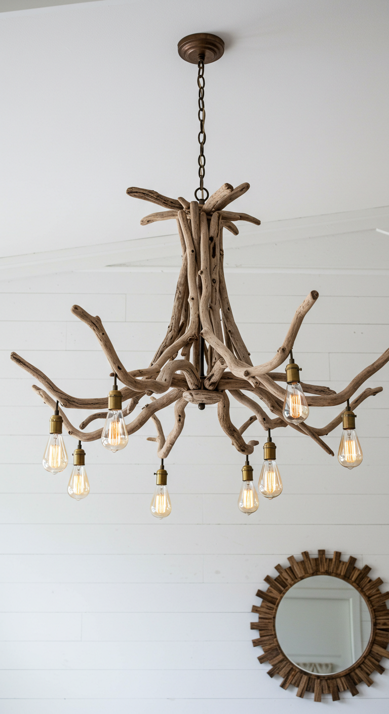 Cette création est idéale pour les intérieurs de style côtier, bohème ou scandinave. Au-dessus d’une grande table familiale, elle devient le sujet de conversation privilégié. Dans un salon avec de hauts plafonds, elle comble l’espace vertical tout en restant aérienne et légère. Le contraste entre le bois brut, patiné par la mer et le sel, et la technologie vintage de l’ampoule Edison crée une harmonie poétique. Vous pouvez accentuer l’effet naturel en enroulant des plantes grimpantes artificielles ou de la mousse préservée autour des branches.