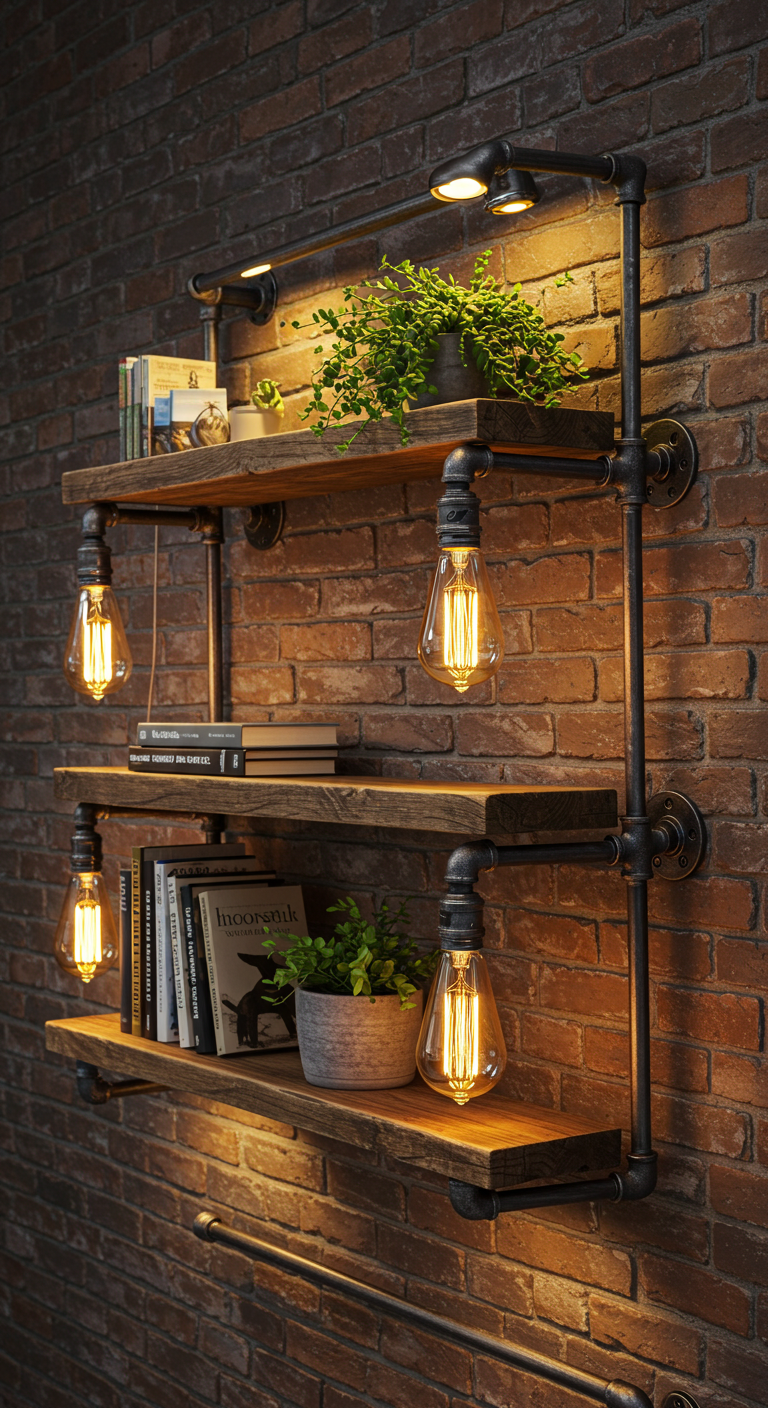 L’étagère murale lumineuse combine rangement et éclairage dans une seule pièce multifonctionnelle ingénieuse. Des ampoules Edison intégrées aux extrémités ou sous les planches en bois récupéré illuminent vos objets décoratifs, livres et plantes tout en créant une ambiance chaleureuse. La structure peut être réalisée avec des tuyaux de plomberie pour un look industriel authentique ou avec des supports en métal épuré pour un style plus moderne.
