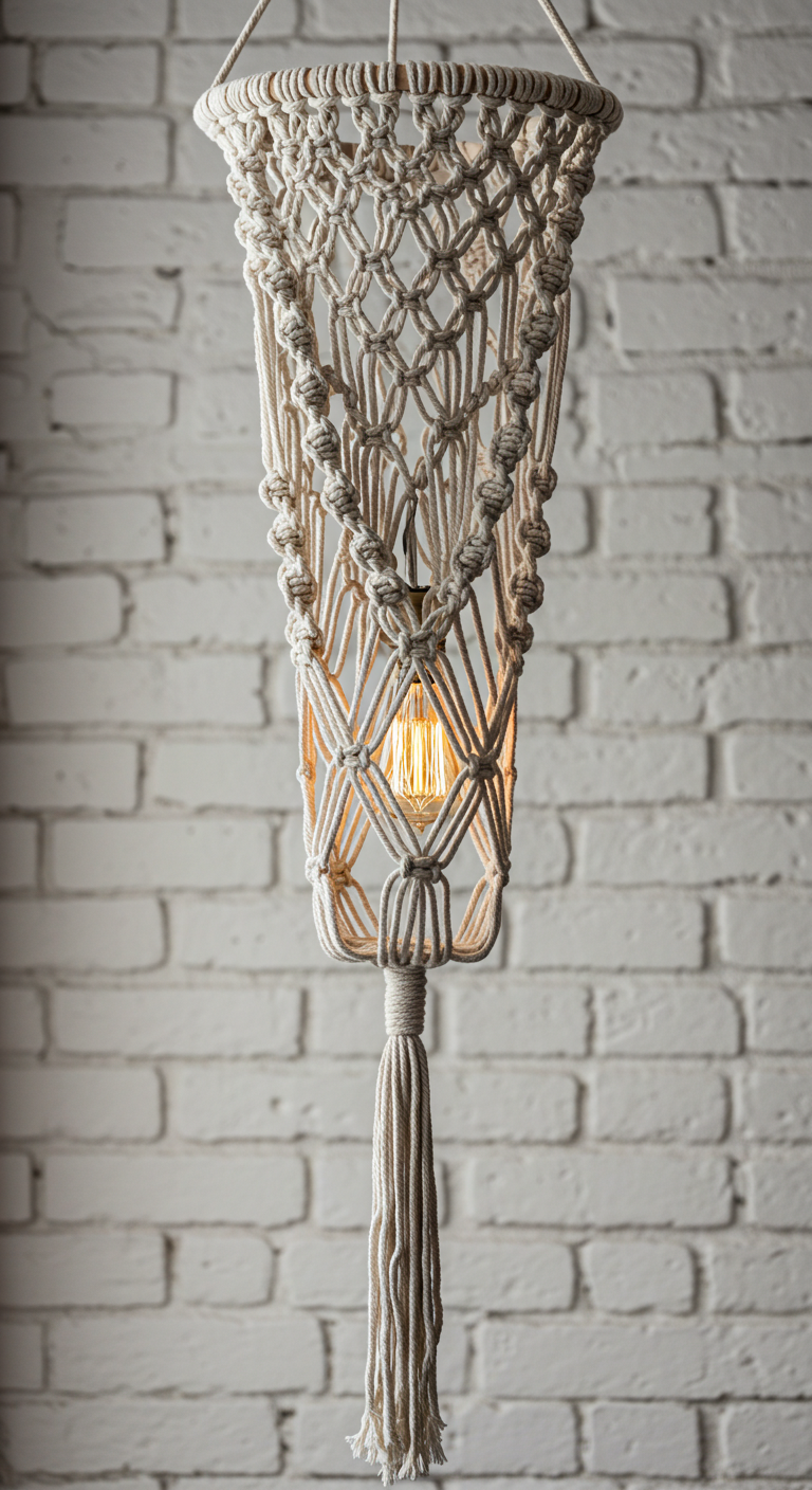 La suspension en macramé avec ampoule Edison marie parfaitement l’artisanat bohème et l’éclairage vintage. Le macramé, cet art ancestral du nouage de cordes, crée des motifs complexes qui filtrent et diffusent la lumière de façon poétique. Les fibres naturelles comme le coton, le jute ou le chanvre apportent une texture organique qui adoucit l’aspect technique de l’ampoule.