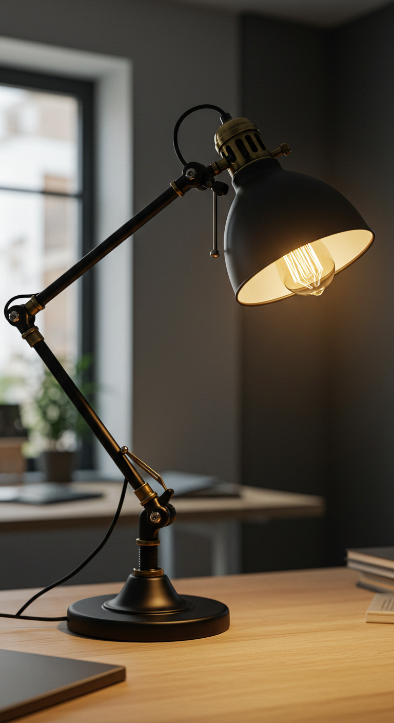 La lampe de bureau industrielle ajustable combine praticité et esthétique rétro pour créer l’outil de travail parfait. Inspirée des lampes d’atelier et d’architecte du début du 20ᵉ siècle, elle offre un éclairage directionnel précis grâce à son bras articulé et sa tête orientable. L’ampoule Edison, contrairement aux LED modernes, crée une lumière chaude qui réduit la fatigue oculaire lors de longues sessions de travail.