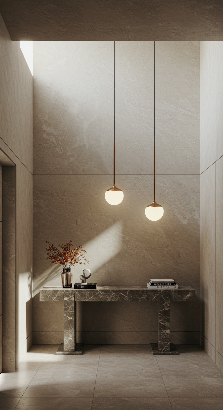 L’éclairage est l’âme de votre entrée. Optez pour une suspension design qui fait office de véritable sculpture lumineuse. Qu’il s’agisse d’une suspension en métal noir mat, d’un lustre contemporain en laiton ou d’une création en rotin naturel, l’éclairage suspendu attire immédiatement l’œil vers le haut et donne une impression de grandeur.