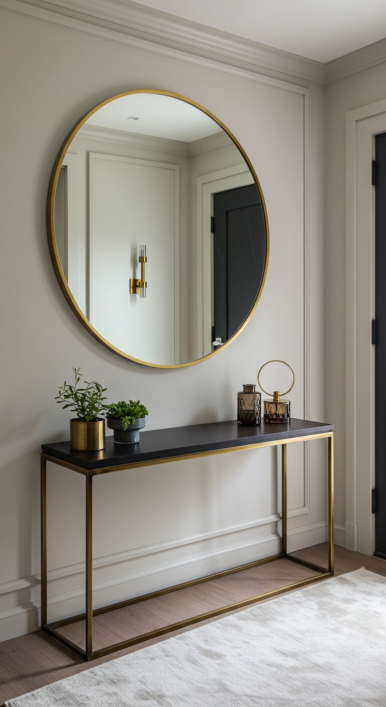 Le miroir rond de grande dimension est devenu un incontournable de la déco moderne. Il apporte douceur et élégance à l’entrée tout en réfléchissant la lumière naturelle pour agrandir visuellement l’espace.