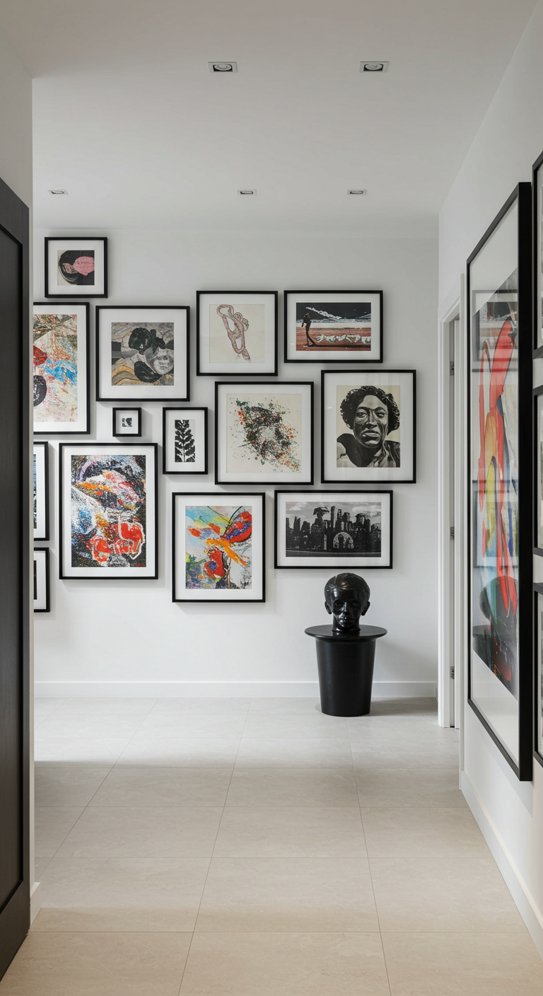 Créez une galerie murale sophistiquée avec une collection de cadres noirs de différentes tailles. Cette technique, appelée “gallery wall”, permet de personnaliser votre entrée tout en conservant une cohérence visuelle grâce à l’uniformité des cadres.