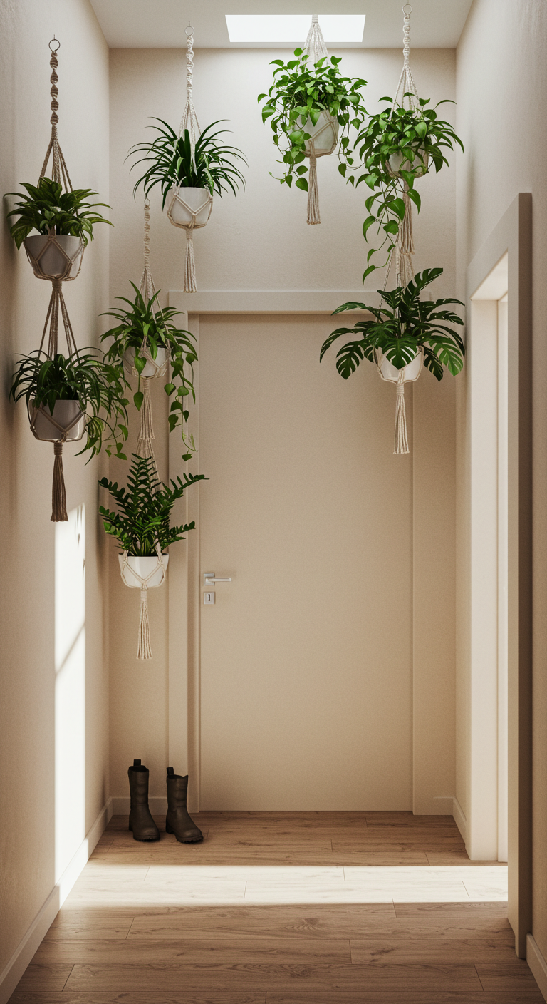 Sélectionnez des plantes qui supportent les variations de luminosité et de température comme le pothos, le scindapsus ou les fougères. Les suspensions en macramé en corde naturelle ou coton ajoutent une texture douce et organique à l’espace.