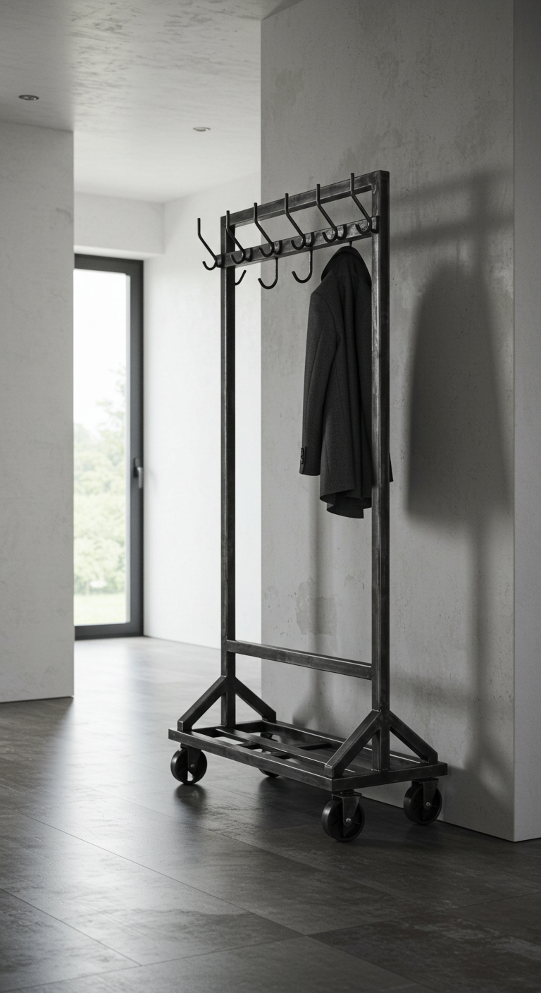 Pour une entrée au style industriel moderne, adoptez un vestiaire sur roulettes en métal noir. Ce type de meuble nomade permet d’adapter l’aménagement selon les saisons et le nombre de manteaux à suspendre.