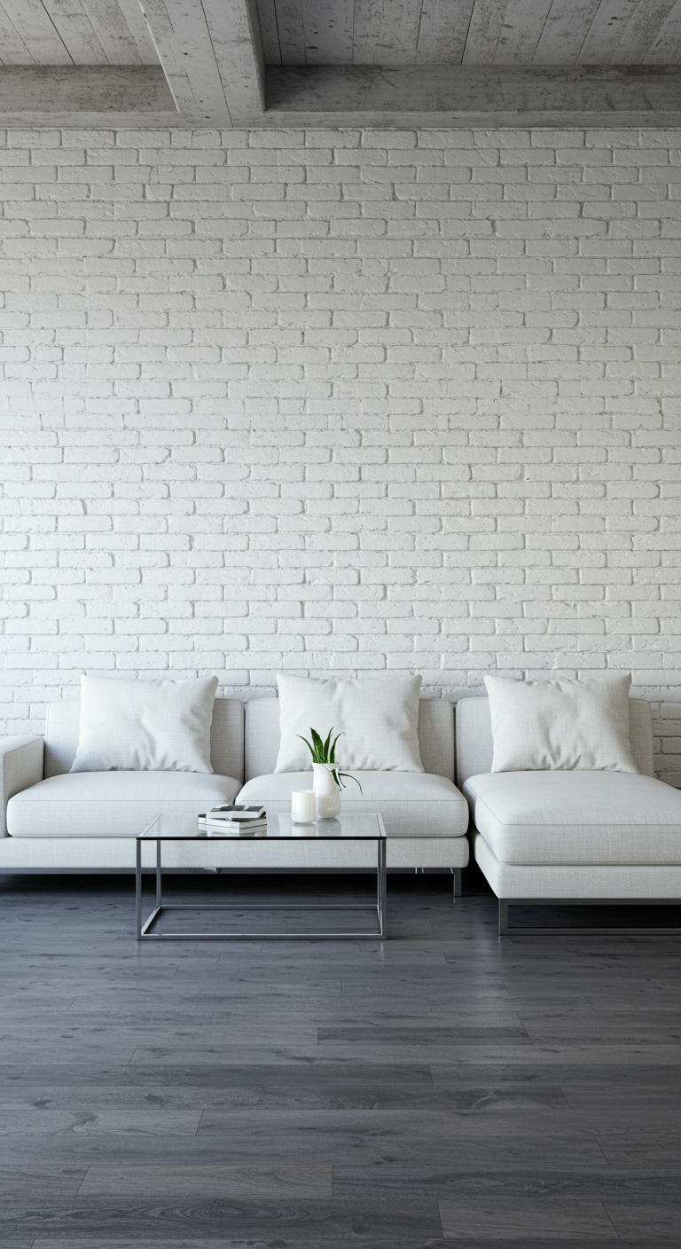 La peinture blanche sur brique crée un contraste subtil entre les joints qui restent légèrement visibles et la surface peinte. Utilisez une peinture spéciale maçonnerie pour une tenue optimale dans le temps.