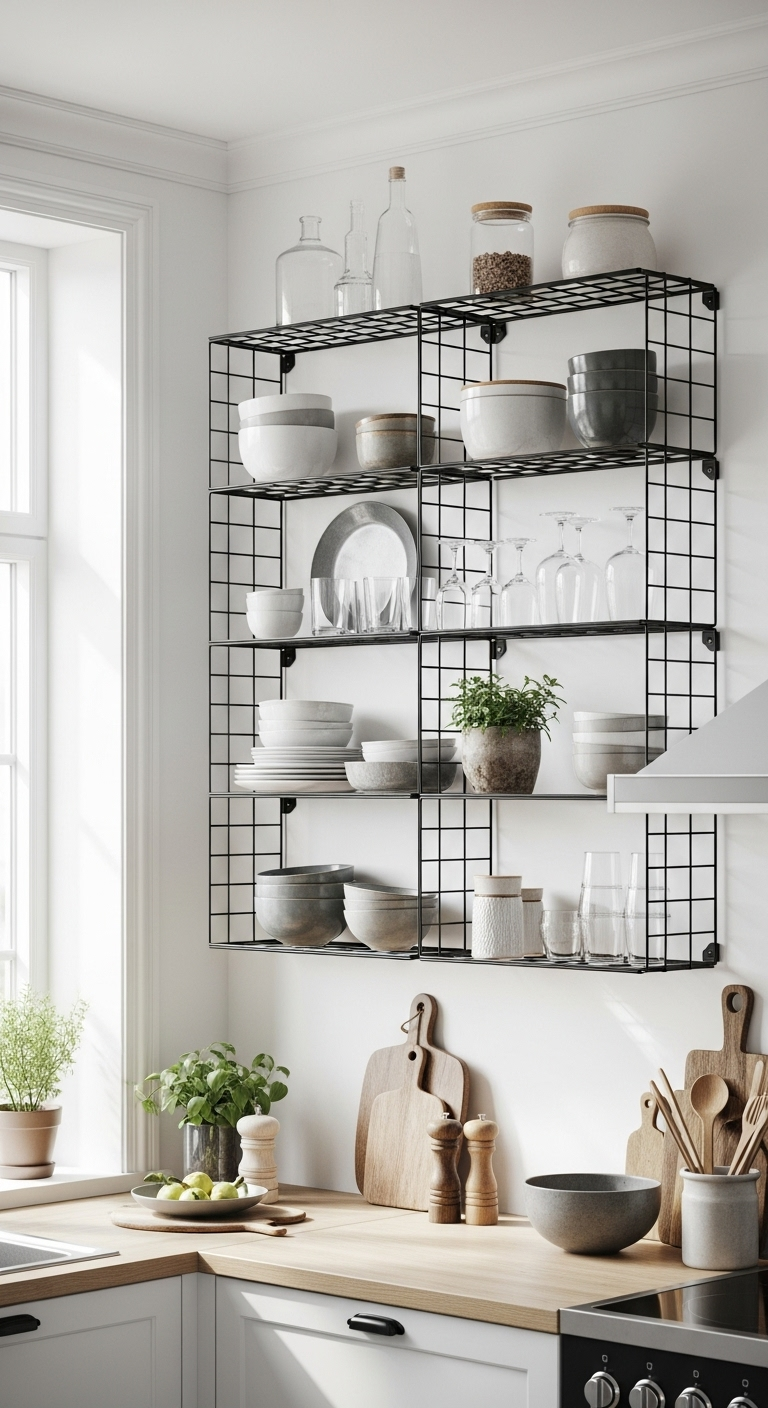 Transformez votre cuisine en véritable espace de chef avec des étagères murales en métal grillagé. Ces rangements ouverts permettent de garder vos ustensiles, vaisselle et épices à portée de main tout en créant un point focal décoratif. L’avantage majeur de ces étagères réside dans leur capacité à laisser circuler l’air, ce qui est particulièrement appréciable dans une cuisine où l’hygiène est primordiale.