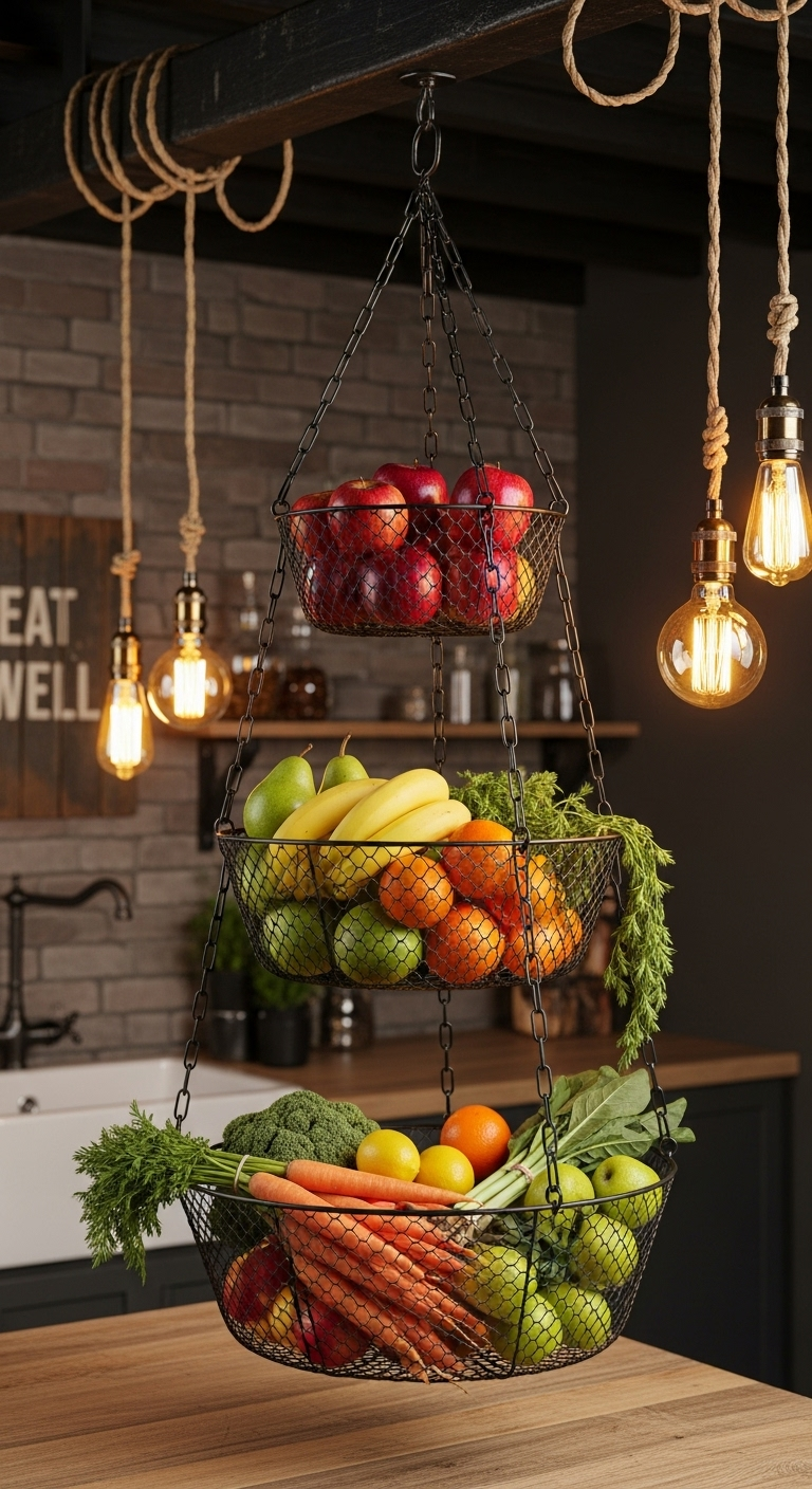 Libérez de l’espace sur vos plans de travail avec un panier suspendu à étages en métal grillagé ! Cette solution de rangement verticale est idéale pour conserver vos fruits et légumes tout en les gardant visibles et accessibles. La structure ajourée permet une excellente circulation de l’air, prolongeant ainsi la fraîcheur de vos produits.