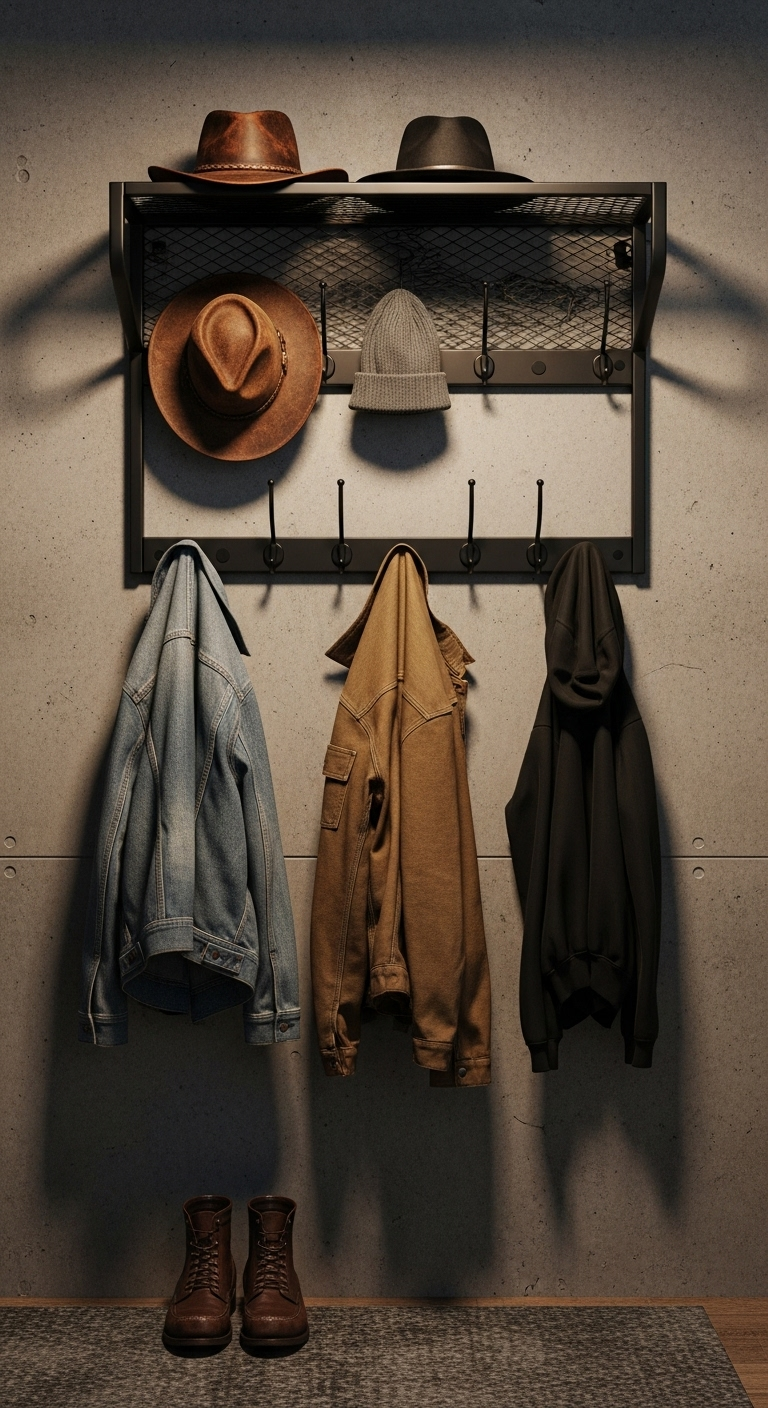 Cette pièce murale devient un véritable point focal de votre entrée. Les crochets inférieurs, souvent en métal brut ou bois récupéré, peuvent accueillir manteaux, sacs, parapluies et laisses pour animaux. L’étagère grillagée du dessus ajoute une dimension pratique supplémentaire tout en conservant ce look industriel si caractéristique. Installez ce système à hauteur moyenne pour qu’il soit accessible à tous les membres de la famille, y compris les enfants. Vous pouvez même ajouter des paniers métalliques sur l’étagère pour créer des zones de rangement personnalisées pour chaque personne.
