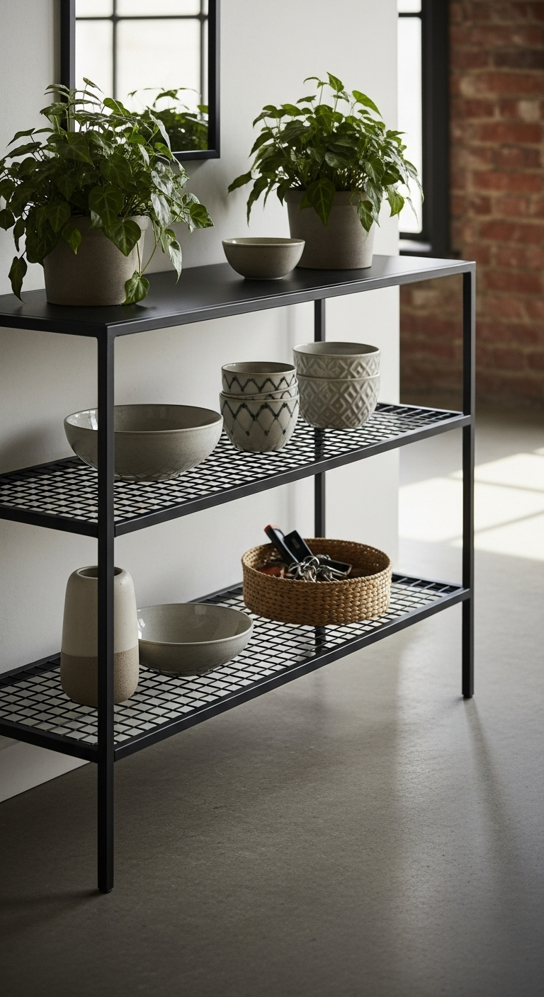 La structure ajourée empêche l’effet de lourdeur qu’aurait un meuble plein, ce qui est particulièrement appréciable dans les espaces restreints comme les entrées. Stylez le plateau supérieur avec un joli vide-poche, un miroir mural au-dessus et une plante verte pour créer un point d’accueil chaleureux. Les étagères grillagées inférieures peuvent accueillir des paniers de rangement pour chaussures, des boîtes décoratives pour accessoires ou simplement servir d’espace d’exposition pour vos objets décoratifs favoris. Cette pièce de mobilier devient ainsi le premier élément que vos invités remarquent en entrant chez vous.