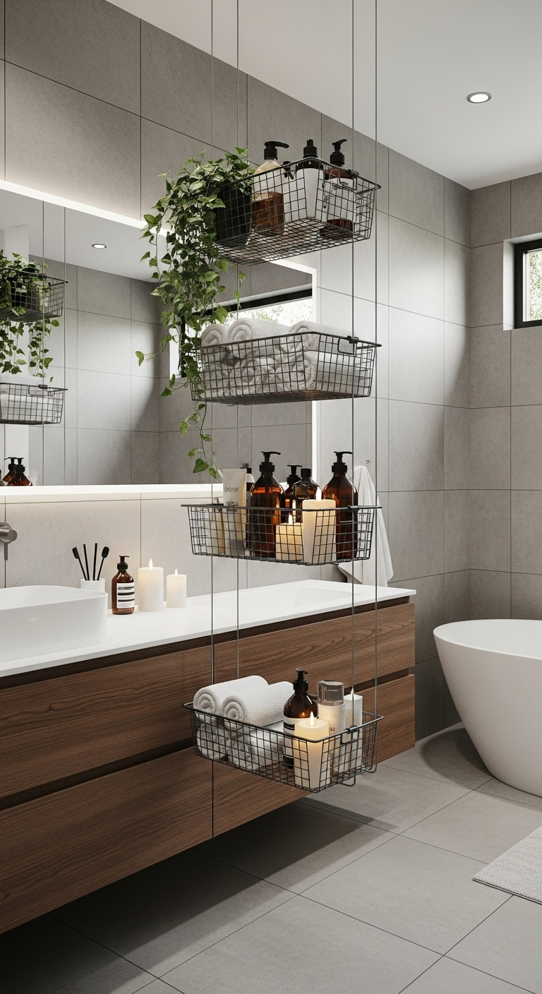 La salle de bains manque souvent d’espace de rangement, surtout dans les petits appartements urbains. Un système de rangement suspendu en métal grillagé résout ce problème avec élégance. Accroché au plafond ou fixé en hauteur sur le mur, il libère l’espace au sol tout en offrant plusieurs niveaux de rangement.