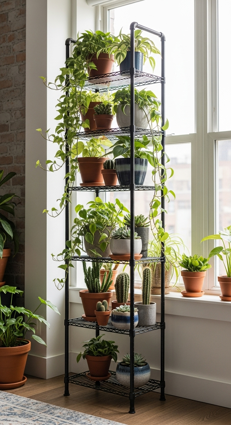 Cette tour végétale permet d’exposer plusieurs plantes sur différents niveaux, créant ainsi une composition luxuriante même dans un espace restreint. Les étagères grillagées présentent plusieurs avantages pour les plantes : elles laissent passer la lumière jusqu’aux niveaux inférieurs, permettent une bonne circulation de l’air réduisant les risques de maladies, et facilitent l’écoulement de l’eau d’arrosage. Placez ce support près d’une fenêtre pour les plantes qui aiment la lumière, ou dans un coin pour créer un point focal verdoyant. Mélangez différentes variétés de plantes : des plantes retombantes en haut pour créer une cascade végétale, des plantes moyennes au milieu, et des succulentes ou cactus en bas. Le contraste entre le métal brut industriel et la douceur organique du végétal crée une harmonie visuelle fascinante.