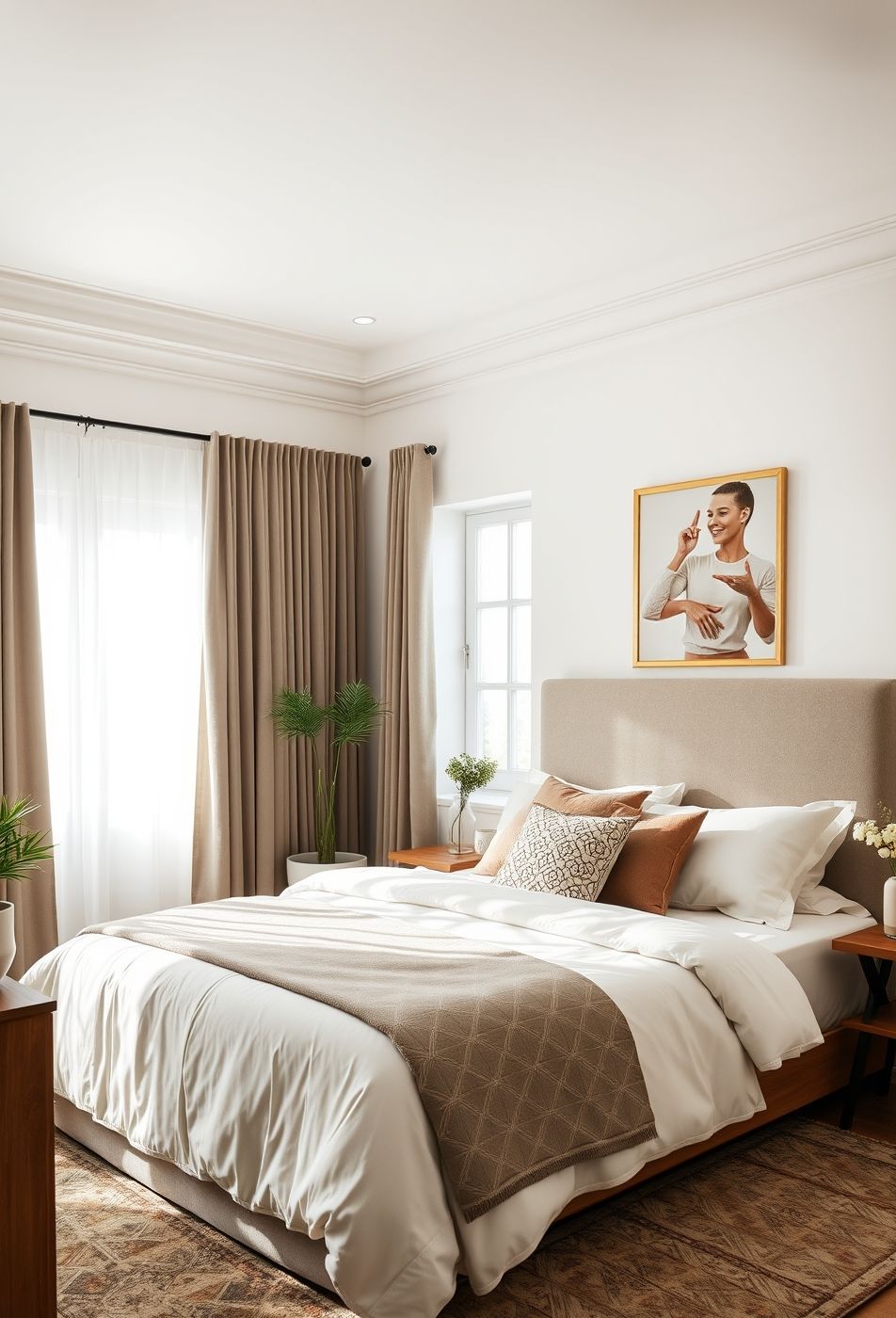 Cette chambre à coucher respire la tranquillité et l’élégance discrète. La palette de couleurs est dominée par des tons neutres et chaleureux, créant une ambiance reposante et accueillante. Les murs blancs contrastent magnifiquement avec les rideaux épais de couleur taupe qui encadrent la fenêtre, adoucissant la lumière naturelle. Le lit, point central de la pièce, est habillé de draps blancs immaculés, rehaussés par un jeté de lit texturé et des coussins décoratifs dans des nuances de beige, de brun et de motifs discrets.