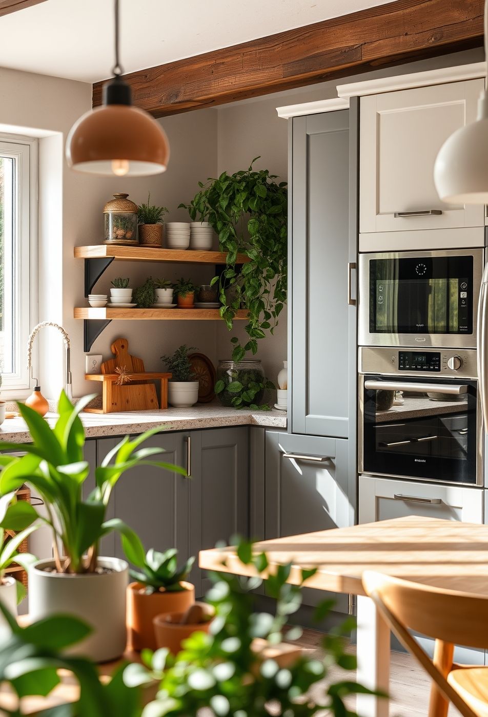 Cette cuisine respire une atmosphère à la fois moderne et chaleureuse, grâce à une fusion harmonieuse de tons neutres et d’une abondance de verdure. La palette de couleurs est douce et apaisante, dominée par des nuances de gris, de bois clair et de blanc, créant ainsi un espace lumineux et aéré. L’omniprésence des plantes est l’élément central de ce style, apportant une touche de fraîcheur et de vitalité à chaque recoin. On remarque une grande variété de plantes, des petites plantes grasses aux herbes aromatiques, en passant par des plantes suspendues, toutes disposées avec soin sur les étagères, les comptoirs et même le rebord de la fenêtre.