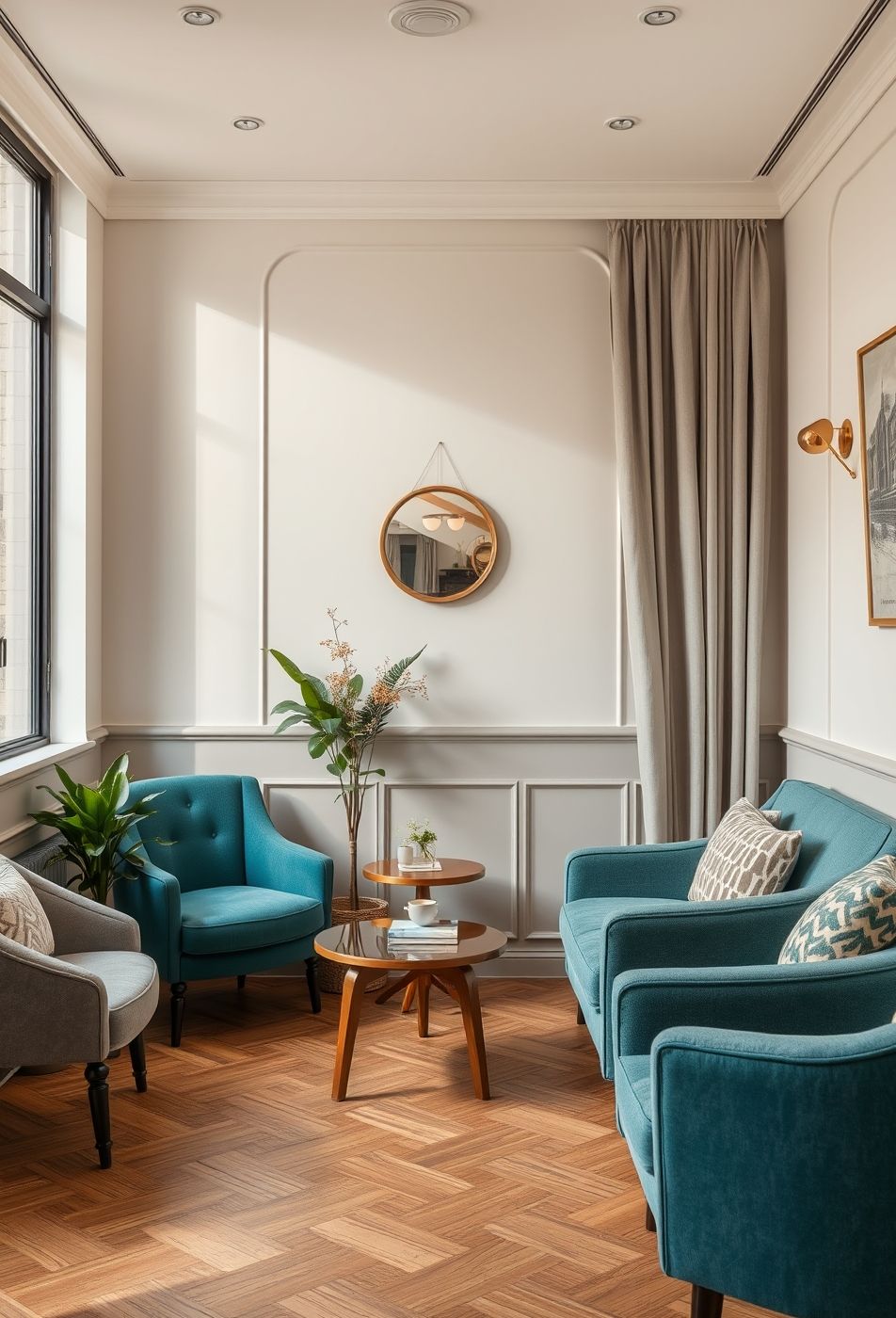 Cet espace respire une élégance discrète, revisitant le style classique avec une palette de couleurs apaisantes et des touches modernes. Les murs, peints dans une teinte neutre et douce, sont rehaussés de moulures délicates qui apportent une dimension architecturale subtile. Le point focal de la pièce est sans aucun doute le mobilier : des fauteuils bleu azur profond invitent à la détente, contrastant harmonieusement avec la chaleur du parquet en bois à motifs chevron. Le miroir rond suspendu et les tables d’appoint en bois contribuent à créer une atmosphère accueillante et sophistiquée.