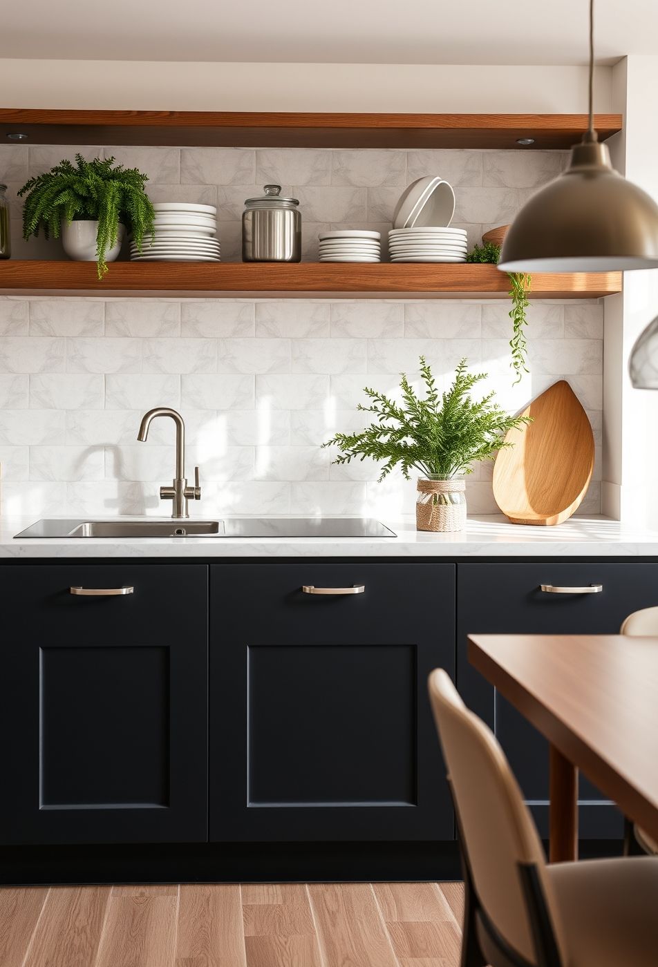 Pour recréer ce style chez vous, n’hésitez pas à investir dans des armoires de cuisine bleu marine de bonne qualité et à les associer à un carrelage blanc texturé pour le dosseret. Pensez également à ajouter des étagères en bois brut pour exposer votre vaisselle et vos plantes, créant ainsi un point focal chaleureux et naturel.
