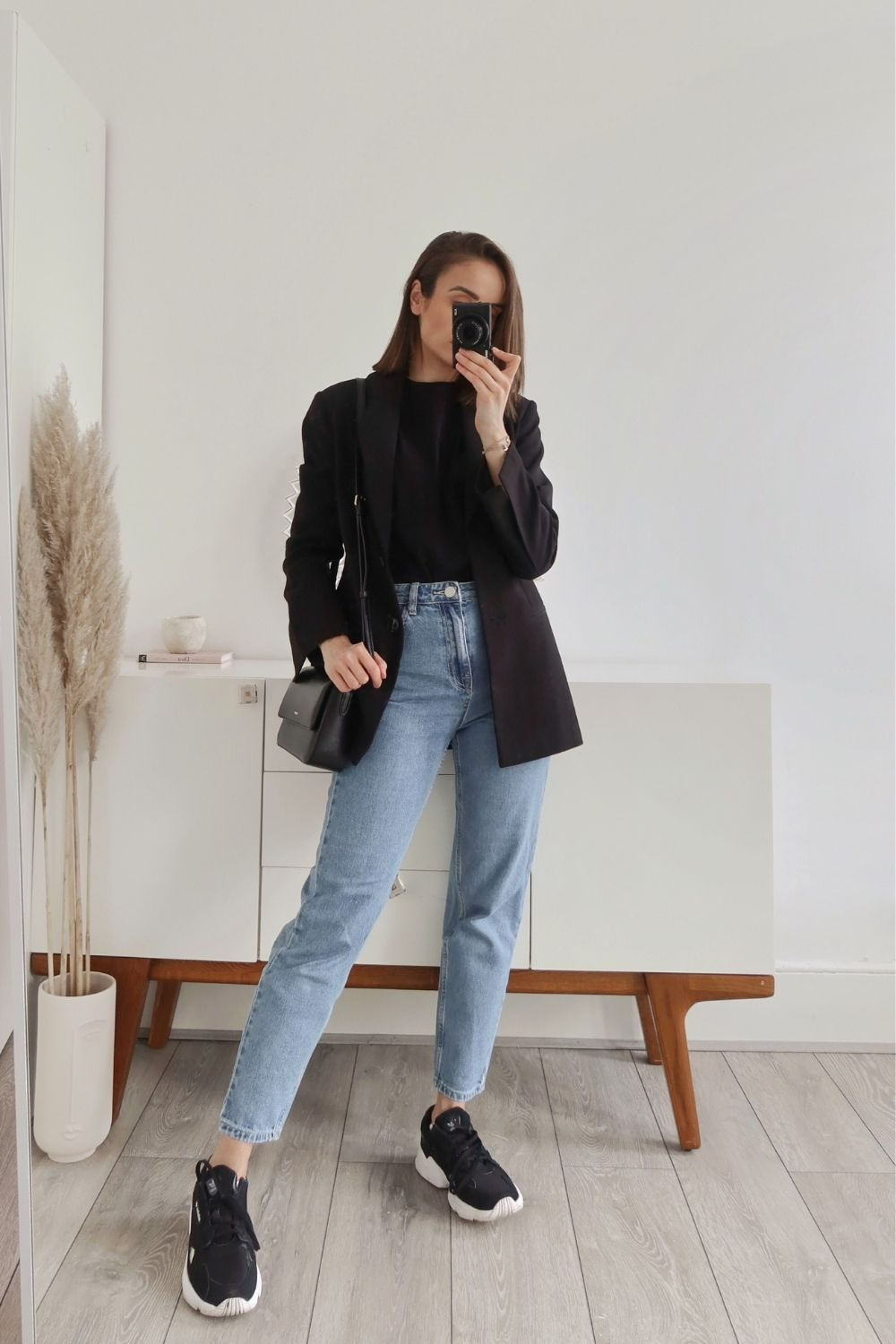 Un look classique et intemporel avec un blazer noir, un t-shirt noir et un jean. Parfait pour tous les jours sur le campus. Astuce : des baskets blanches apporteront une touche décontractée et tendance.