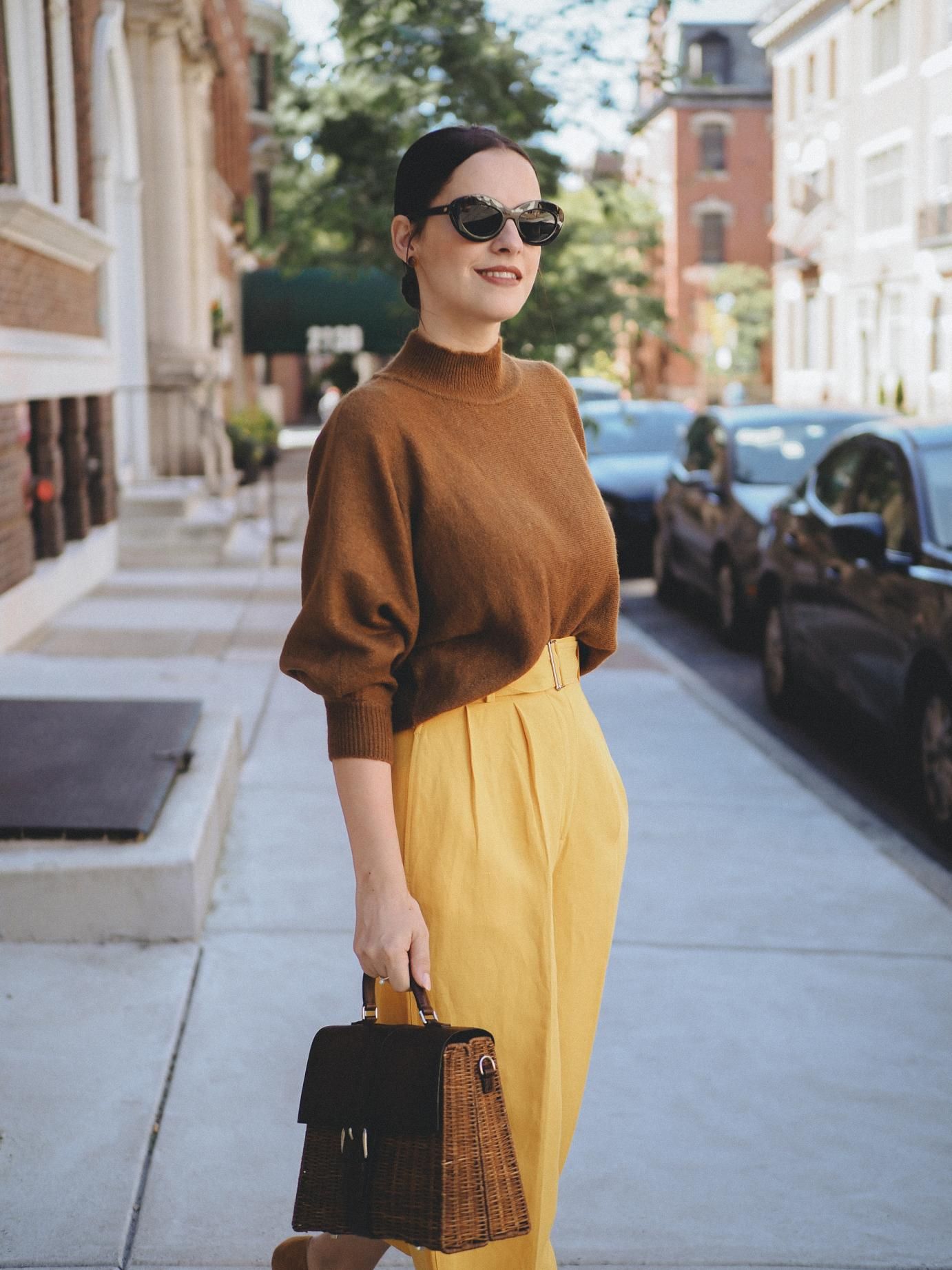 Osez la couleur avec ce pantalon jaune moutarde associé à un pull marron chaud et confortable. Ce look est parfait pour les cours, un déjeuner entre amis ou une sortie en ville. Astuce : un sac en osier apportera une touche bohème chic.