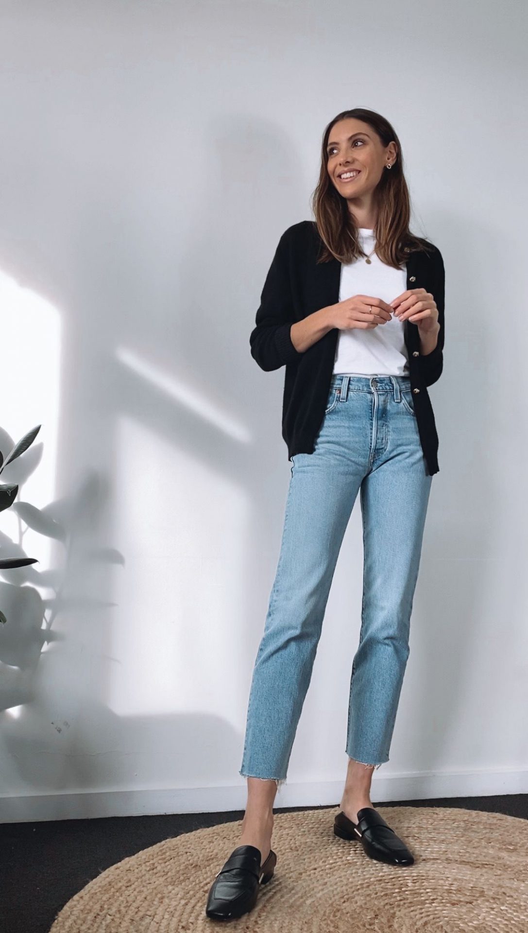 Un look effortless chic avec un jean, un t-shirt blanc et un cardigan noir boutonné. Parfait pour les cours ou une sortie décontractée. Astuce : des mocassins noirs ajouteront une touche sophistiquée.