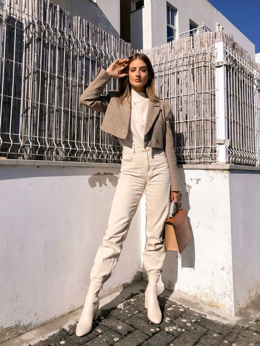 Adoptez le monochrome avec ce total look beige ultra tendance ! La veste courte structurée et le pantalon large créent une silhouette moderne et confortable, parfaite pour les journées sur le campus. Astuce : rehaussez le look avec des accessoires dorés.