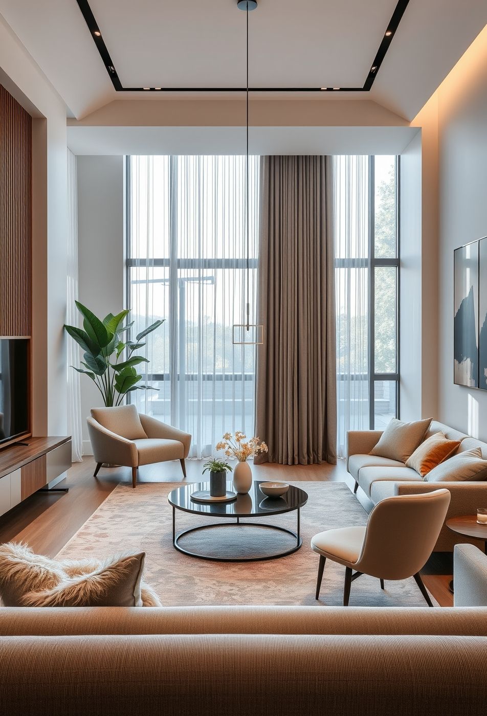 L’image révèle un intérieur où la simplicité sophistiquée rencontre une esthétique moderne. L’atmosphère est baignée de lumière naturelle grâce aux vastes fenêtres, habillées de rideaux légers et drapés, créant un jeu subtil d’ombre et de clarté. La palette de couleurs est dominée par des tons neutres et chauds – beige, crème, taupe – qui se fondent harmonieusement pour conférer à l’espace une sensation d’apaisement et de sophistication discrète. Les meubles, aux lignes épurées, privilégient le confort et l’ergonomie, avec des fauteuils invitants et un canapé moelleux, agrémenté de coussins aux couleurs assorties.