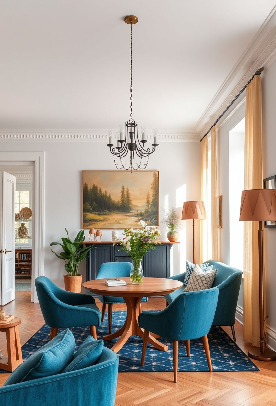 L’image présente un intérieur qui oscille entre le charme rétro et une fraîcheur contemporaine. La pièce est dominée par une palette de couleurs apaisante, centrée autour d’un bleu azur vif que l’on retrouve dans le tapis, les fauteuils et le buffet. Ce bleu contraste magnifiquement avec les tons chauds du bois clair du parquet et de la table ronde. Un tableau représentant un paysage forestier apporte une touche de nature et de sérénité. L’éclairage est assuré par un lustre en fer forgé au style ancien ainsi que par des lampadaires aux abat-jours en tissu, créant une ambiance douce et accueillante.
