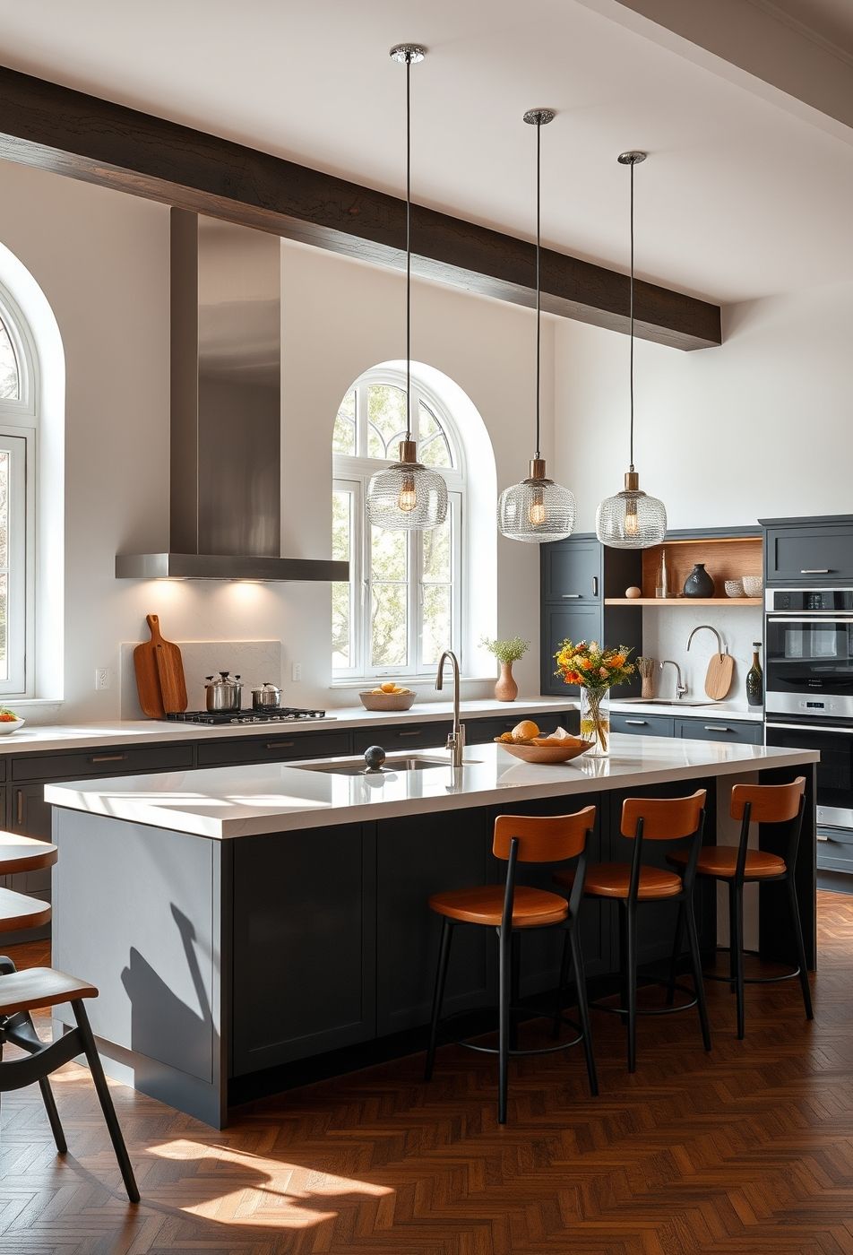 Cette cuisine dégage une impression de sophistication décontractée, mélangeant des éléments modernes et rustiques avec une harmonie subtile. Les armoires gris anthracite créent une base élégante, tandis que le plan de travail blanc immaculé reflète la lumière naturelle abondante qui entre par les fenêtres arquées. Les poutres apparentes en bois foncé au plafond ajoutent une touche chaleureuse et texturée, contrastant magnifiquement avec les lignes épurées de la hotte en acier inoxydable. Les suspensions en verre texturé, avec leurs détails en métal couleur bronze, apportent une touche d’originalité et diffusent une lumière douce et accueillante.