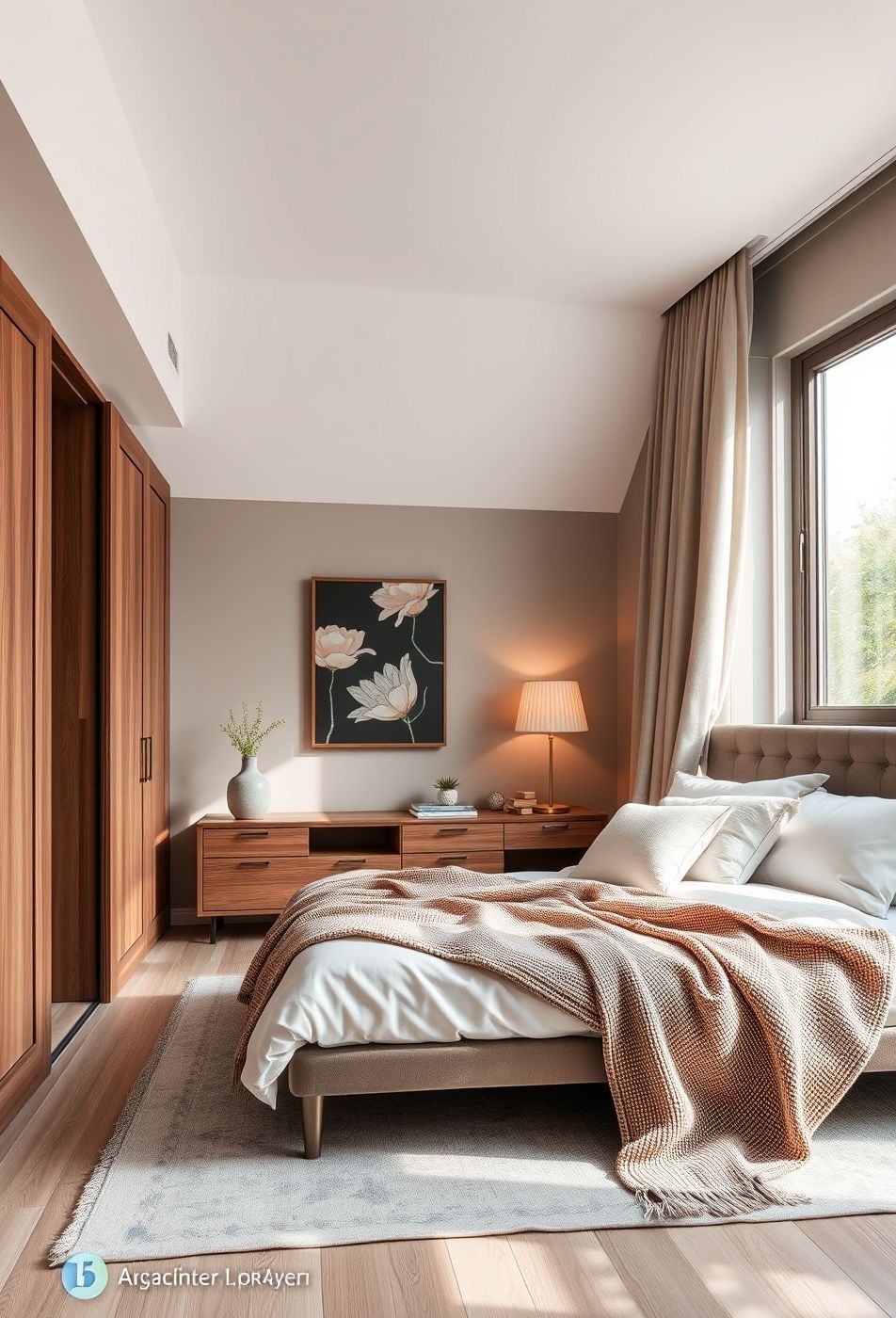 Cette chambre à coucher respire la sérénité grâce à une palette de couleurs douces et naturelles. Le blanc immaculé du linge de lit et de la commode contraste harmonieusement avec le brun chaleureux du mur accent et des meubles en bois. L’accent est mis sur la simplicité et le confort, avec des détails subtils comme les coussins texturés et le jeté de lit en maille douce. L’ambiance est à la fois moderne et réconfortante, créant un espace propice à la détente et au repos.