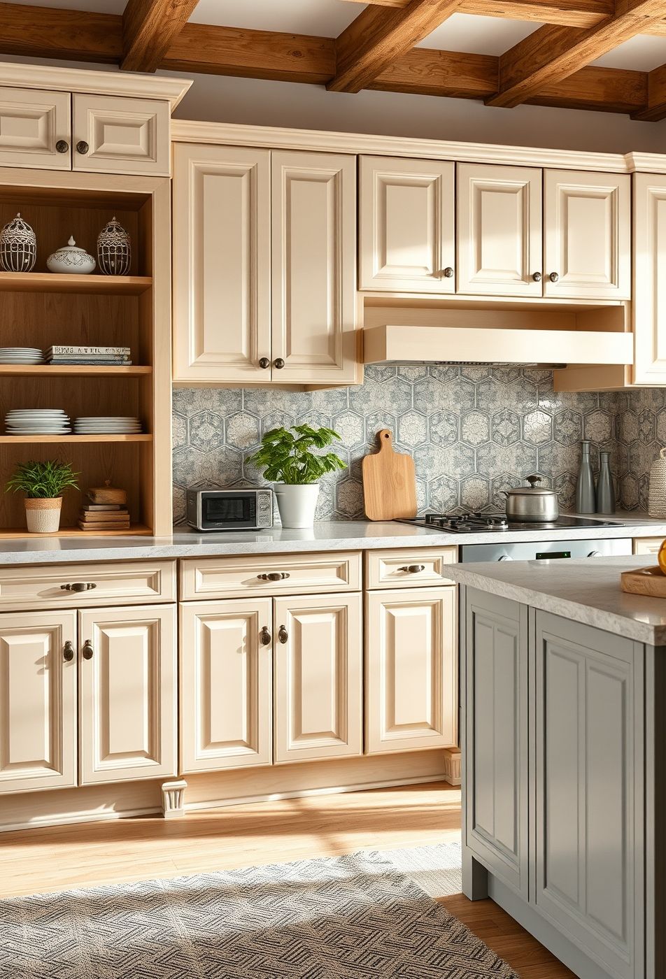Cette cuisine capture un style à la fois chaleureux et sophistiqué. Les armoires de couleur crème aux détails classiques offrent un contraste subtil avec le gris doux de l’îlot central. Les étagères ouvertes, ornées d’objets décoratifs et de plantes vertes, ajoutent une touche de vie et de personnalité à l’espace. Le dosseret en carrelage aux motifs délicats apporte une note d’élégance discrète, tandis que les poutres apparentes au plafond rappellent l’authenticité des cuisines de campagne.